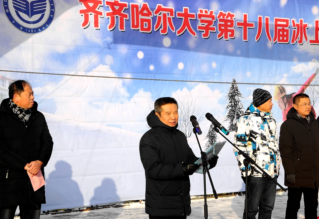 李英杰在致開幕詞時(shí)指出,立足冰天雪地,打造“金山銀山”,是習(xí)近平總書記對(duì)于我們龍江人的殷切期望。我們要堅(jiān)持用習(xí)近平新時(shí)代中國(guó)特色社會(huì)主義思想和黨的十九大、十九屆四中全會(huì)精神武裝頭腦,牢記“四個(gè)意識(shí)”,堅(jiān)定“四個(gè)自信”,堅(jiān)決做到“兩個(gè)維護(hù)”,更加緊密地團(tuán)結(jié)在以習(xí)近平同志為核心的黨中央周圍,高舉中國(guó)特色社會(huì)主義偉大旗幟,進(jìn)一步鞏固“不忘初心、牢記使命”主題教育成果。作為黑龍江省西部地區(qū)唯一一所綜合性大學(xué),我校始終堅(jiān)持發(fā)展冰雪體育運(yùn)動(dòng),引領(lǐng)區(qū)域體育風(fēng)尚,冰上運(yùn)動(dòng)會(huì)更是我校傳統(tǒng)特色的三大群眾性體育盛會(huì)之一,已成為美麗環(huán)湖大學(xué)的文化品牌和賀歲大戲。希望全校師生以本屆運(yùn)動(dòng)會(huì)為契機(jī),堅(jiān)持推進(jìn)體育教學(xué)改革,著力提升體育教育質(zhì)量,積極開展各類體育活動(dòng),大力營(yíng)造校園體育文化,頑強(qiáng)拼搏、團(tuán)結(jié)協(xié)作、永不言敗、超越自我,共創(chuàng)我們齊齊哈爾大學(xué)更加美好的明天。