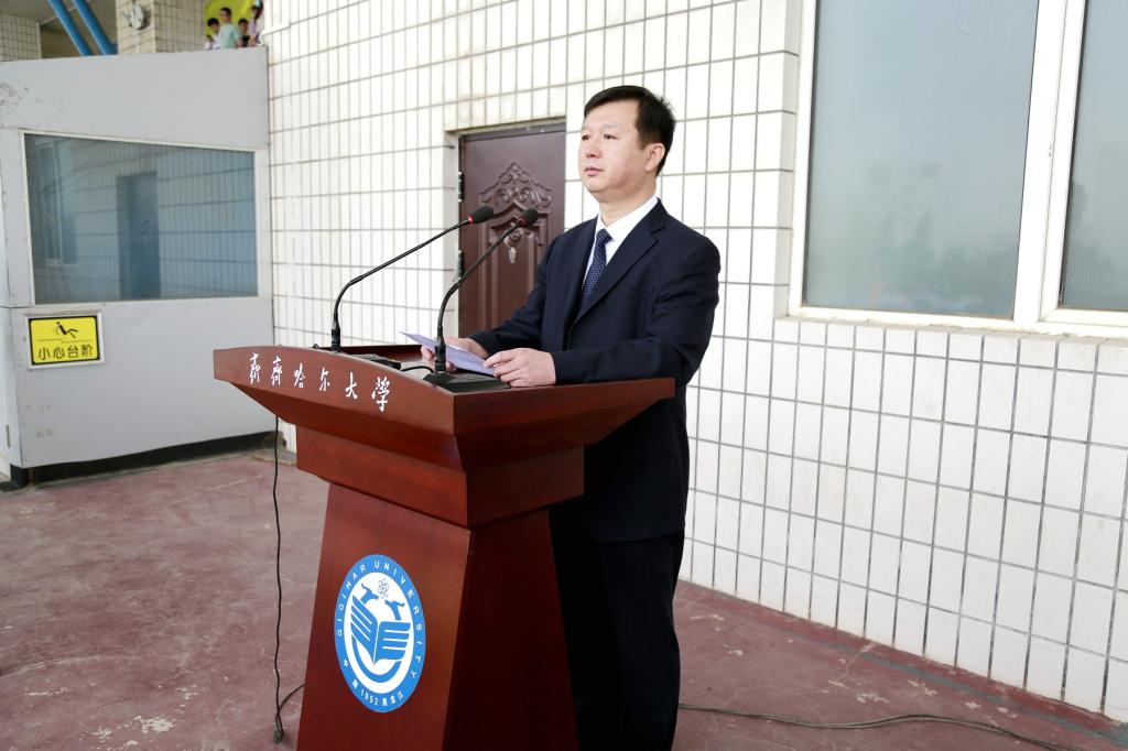 在莊嚴(yán)的升旗儀式結(jié)束后,校長董玉庭在大會上致開幕辭。他代表學(xué)校對本屆運動會的勝利召開表示祝賀,向全體運動員、裁判員以及付出辛勤勞動的工作人員致以誠摯的問候,向熱情參與并大力支持學(xué)校體育活動,為學(xué)校事業(yè)發(fā)展做出貢獻(xiàn)的老師和同學(xué)們致以崇高的敬意。