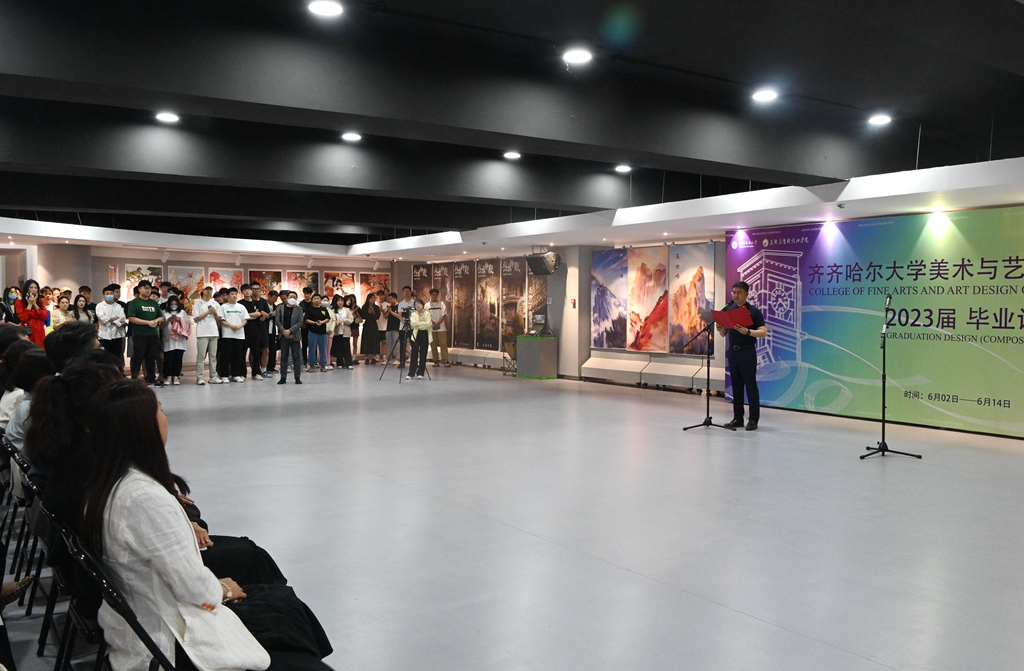 6月2日上午,我校美術(shù)與藝術(shù)設(shè)計(jì)學(xué)院2023屆畢業(yè)設(shè)計(jì)(創(chuàng)作)系列作品展在齊齊哈爾大學(xué)美術(shù)館開幕,校黨委副書記齊宏偉、副校長李奇楠,齊齊哈爾市委宣傳部副部長丁云,齊齊哈爾市文聯(lián)黨組書記、主席朱虹宇,齊齊哈爾市鐵鋒區(qū)、梅里斯區(qū)、昂昂溪區(qū)和齊齊哈爾高等師范??茖W(xué)校相關(guān)部門負(fù)責(zé)人應(yīng)邀出席開幕式,齊齊哈爾市著名設(shè)計(jì)公司、實(shí)習(xí)實(shí)訓(xùn)基地代表和我校相關(guān)部門負(fù)責(zé)人,美術(shù)與藝術(shù)設(shè)計(jì)學(xué)院各系部中心主任及指導(dǎo)教師代表、學(xué)生代表參加了開幕式。