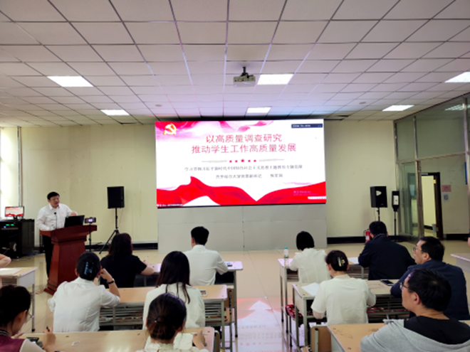 5月24日下午,校黨委副書記張文治以《以高質(zhì)量調(diào)查研究推動(dòng)學(xué)生工作高質(zhì)量發(fā)展》為題,圍繞深刻認(rèn)識(shí)調(diào)查研究作為黨的光榮傳統(tǒng)和優(yōu)良作風(fēng)形成的歷史邏輯、深刻認(rèn)識(shí)“調(diào)查研究是我們黨的傳家寶、是做好各項(xiàng)工作的基本功”的重要政治論斷、深刻認(rèn)識(shí)以高質(zhì)量調(diào)查研究推動(dòng)學(xué)生工作“破難題、促發(fā)展”的方法路徑等三個(gè)方面內(nèi)容,深入闡釋了“如何以高質(zhì)量調(diào)查研究推動(dòng)學(xué)生工作高質(zhì)量發(fā)展”這個(gè)問題。強(qiáng)調(diào)廣大學(xué)生工作干部要在實(shí)踐中進(jìn)一步找準(zhǔn)黨的二十大決策部署與本職工作的主要關(guān)聯(lián)點(diǎn),在推動(dòng)齊齊哈爾大學(xué)在參與高等教育合作競(jìng)爭(zhēng)中,走在前列、爭(zhēng)做表率。要堅(jiān)持利用好調(diào)查研究這個(gè)我們黨的“傳家寶”,在實(shí)現(xiàn)“破難題、促發(fā)展”中推動(dòng)學(xué)生工作實(shí)現(xiàn)高質(zhì)量發(fā)展。