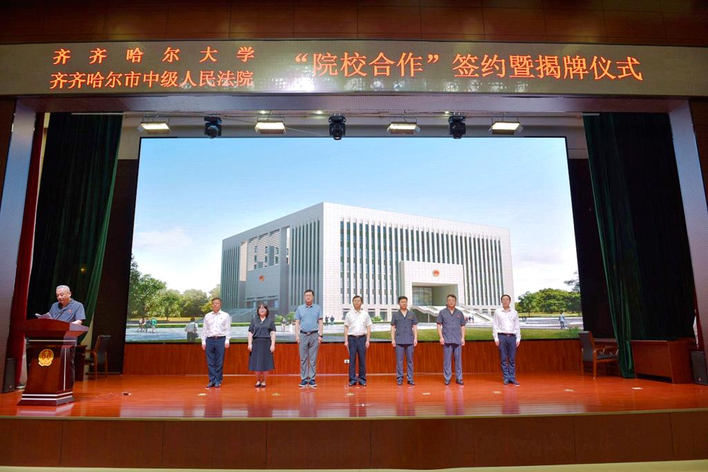 為進(jìn)一步深化校院合作共建,促進(jìn)法學(xué)理論與司法實(shí)踐銜接融合,推動高校與法院的優(yōu)勢互補(bǔ)、相互協(xié)作,7月5日上午,我校與齊齊哈爾市中級人民法院“校院合作”簽約暨“齊齊哈爾大學(xué)法學(xué)實(shí)踐教學(xué)基地”“齊齊哈爾大學(xué)審判理論與實(shí)務(wù)研究基地”揭牌儀式在齊齊哈爾市中級人民法院舉行。副校長李奇楠,齊齊哈爾市中級人民法院黨組書記、院長朱衛(wèi)國,齊齊哈爾市中級人民法院黨組副書記、常務(wù)副院長李國軍出席儀式;齊齊哈爾市中級人民法院相關(guān)工作負(fù)責(zé)人,我校教務(wù)處、科研處、哲學(xué)與法學(xué)學(xué)院相關(guān)負(fù)責(zé)人參加儀式。儀式由李國軍主持。