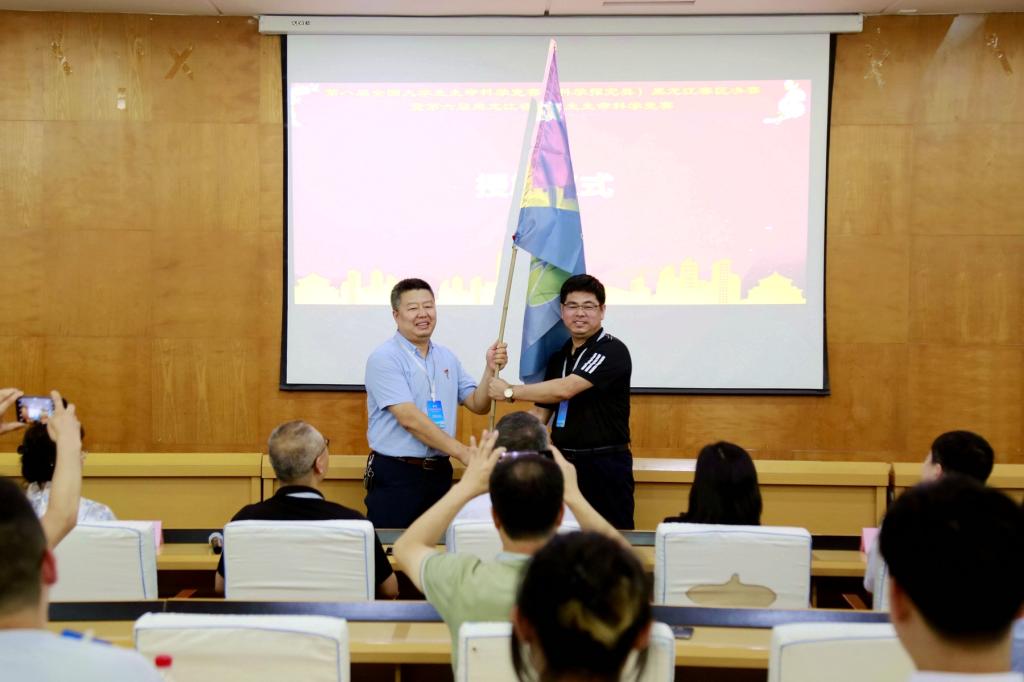 李杰在閉幕式上宣布了下一屆競賽承辦單位,王志剛教授代表學(xué)校向大慶師范學(xué)院副院長殷亞杰交接賽旗。