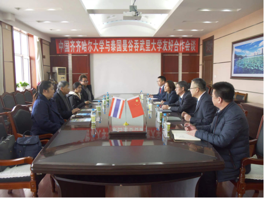 潘亞·隆古朗對(duì)我校的熱情接待表示感謝,對(duì)我校的辦學(xué)成果表示贊賞,并介紹了曼谷吞武里大學(xué)的辦學(xué)歷史、學(xué)科設(shè)置等基本情況。他表示,曼谷吞武里大學(xué)非常重視和中國(guó)高校的合作與交流,希望通過(guò)此次訪問(wèn)進(jìn)一步增進(jìn)與齊齊哈爾大學(xué)在多領(lǐng)域開(kāi)展務(wù)實(shí)合作,實(shí)現(xiàn)合作共贏。
