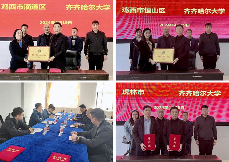 此前,學(xué)校分別與雞西市滴道區(qū)、雞西市恒山區(qū)、綏化市、虎林市開展校地合作洽談會(huì)并簽署合作框架協(xié)議,并分別授予實(shí)習(xí)實(shí)訓(xùn)基地、就業(yè)創(chuàng)業(yè)基地、人才工作站牌匾。