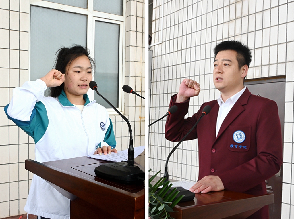 運(yùn)動(dòng)員代表、學(xué)校第二十二屆田徑運(yùn)動(dòng)會(huì)十佳運(yùn)動(dòng)員、理學(xué)院數(shù)學(xué)與應(yīng)用數(shù)學(xué)(師范類)專業(yè)王曉婷同學(xué)代表全體運(yùn)動(dòng)員宣誓,裁判員代表、體育學(xué)院教師馬正輝代表全體裁判員宣誓。
