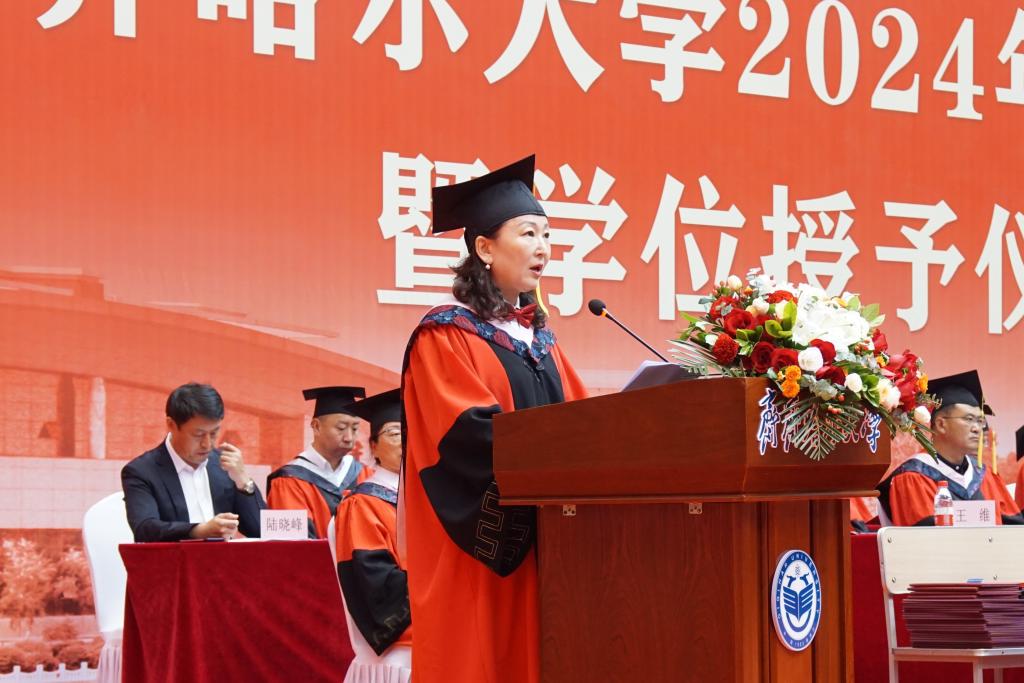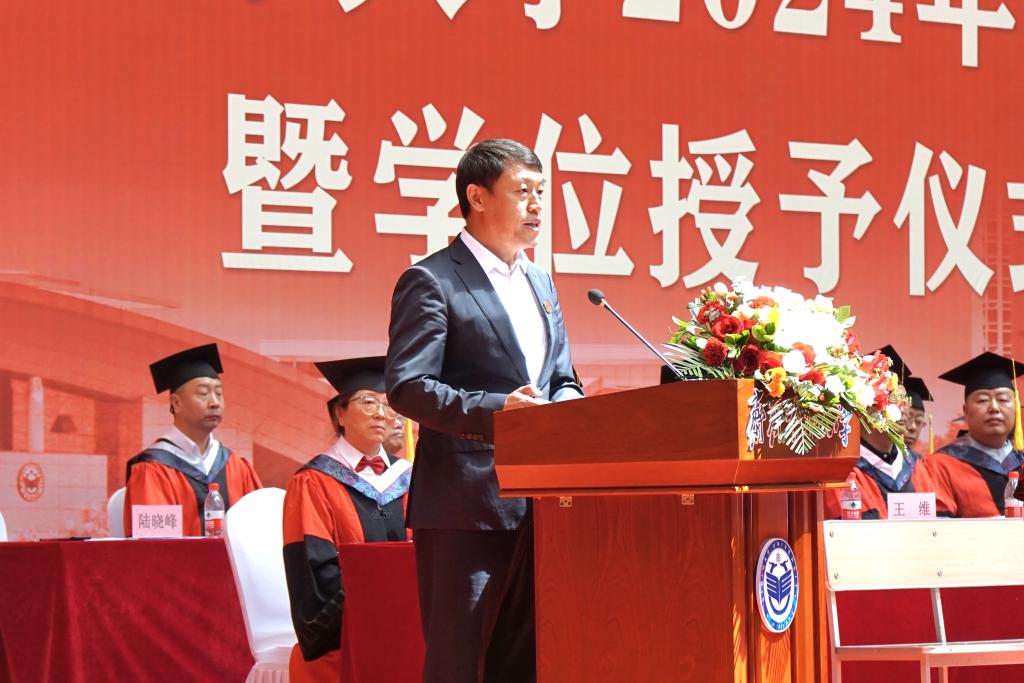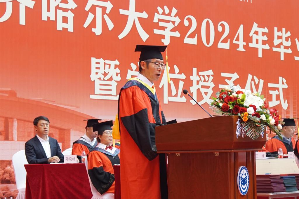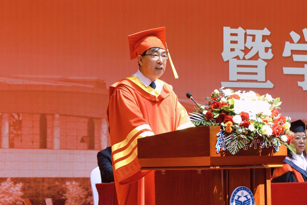 校學(xué)位評定委員會主席、校長郝文斌在畢業(yè)典禮上發(fā)表了講話,他代表全校師生員工向全體畢業(yè)生致以最熱烈的祝賀!向老師們、家長們致以最誠摯的謝意!向現(xiàn)場的家長代表表示最熱烈的歡迎!他以“不一樣的齊大 不一樣的自己”為題,讓畢業(yè)生們再一次回望朝夕相處的母校,感受不一樣的齊大。他說,不一樣的齊大,是底蘊深厚的齊大;不一樣的齊大,是實力強勁的齊大;不一樣的齊大,是特色鮮明的齊大;不一樣的齊大,是充滿潛力的齊大;不一樣的齊大,是飽含情懷的齊大?!案腥诵恼?,莫先乎情?!睂W(xué)校秉持愛生如子、愛師如親、愛校如家的辦學(xué)理念,努力讓每一個學(xué)生感受到齊大的溫暖。齊大的愛,是傳承中華文化,相互陪伴;齊大的愛,是知微見著、關(guān)懷備至。今天之后,大家在齊大的身份認(rèn)證將從“學(xué)生”變成“校友”,請帶著母校的濃情厚愛,披荊斬棘、勇毅前行!