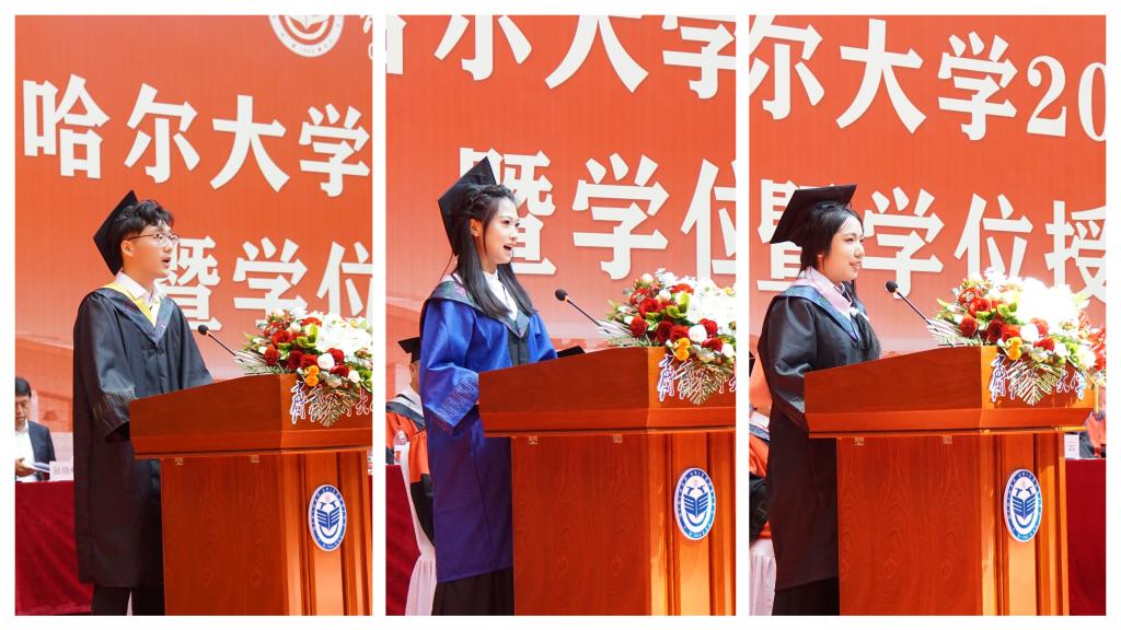 本科生畢業(yè)生代表、計算機與控制工程學(xué)院林欣嚴(yán)同學(xué),研究生畢業(yè)生代表、文學(xué)與歷史文化學(xué)院(新聞傳播學(xué)院)姜易同學(xué),留學(xué)生畢業(yè)生代表、來自泰國的王詩麗同學(xué)分別發(fā)言。