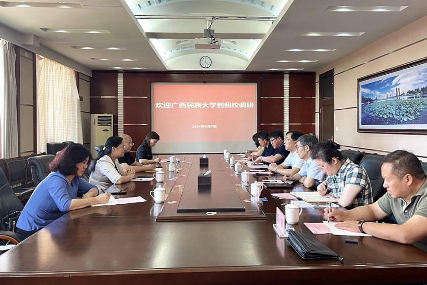 8月6日下午,廣西民族大學(xué)校長韋仕珍、副校長姜明國等一行4人來到我校調(diào)研交流。學(xué)校在辦公樓504會(huì)議室召開座談會(huì),校長郝文斌、副校長張樹軍會(huì)見了韋仕珍一行。