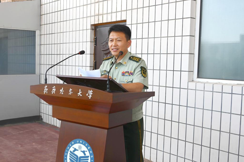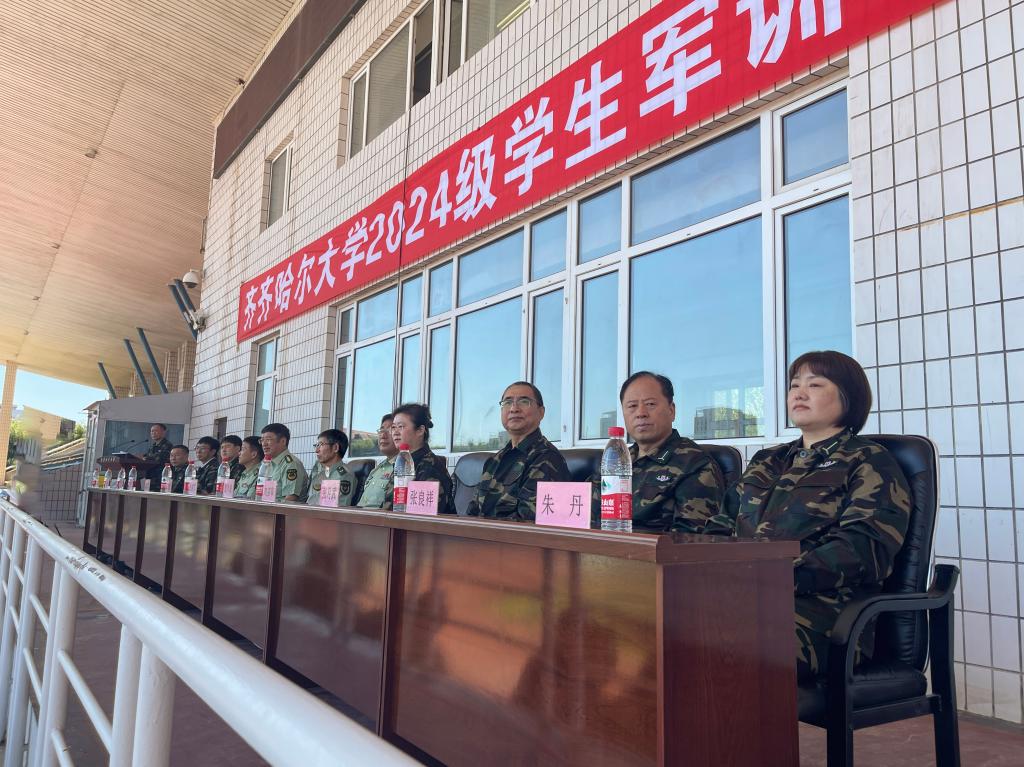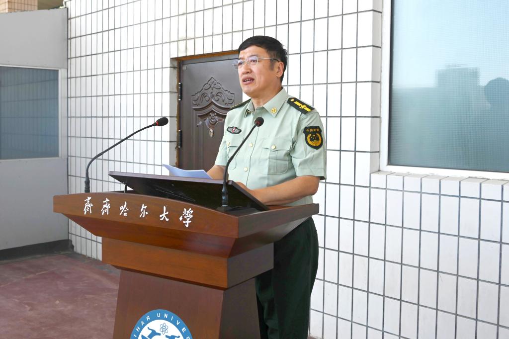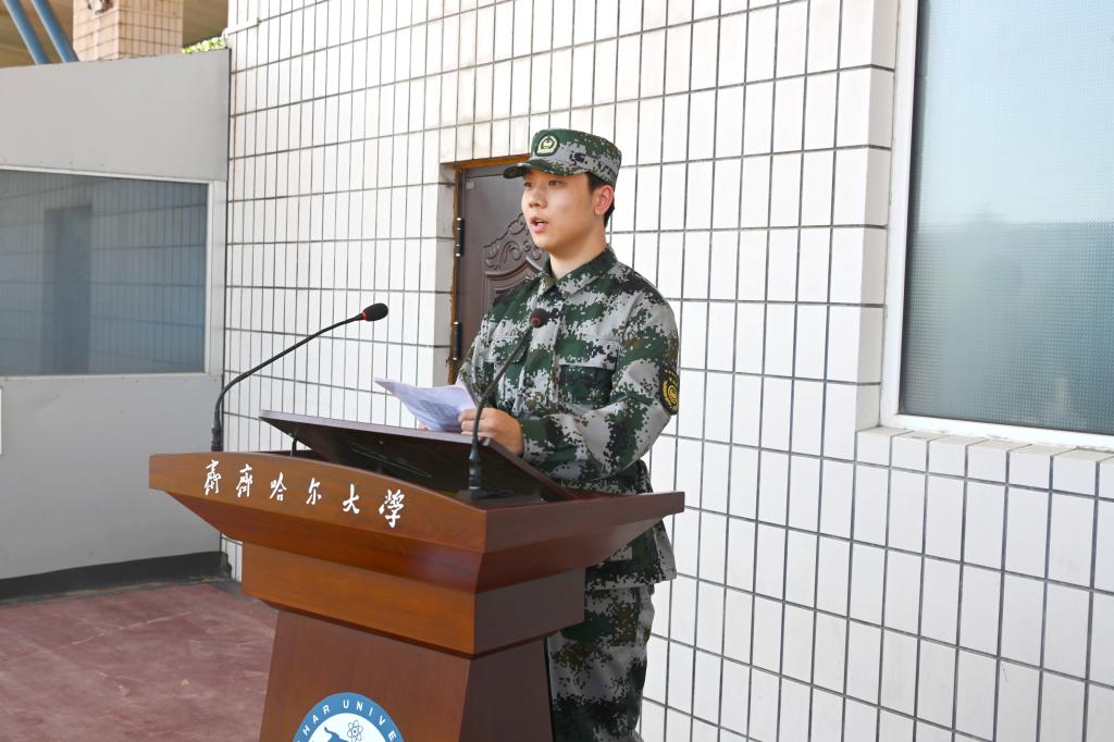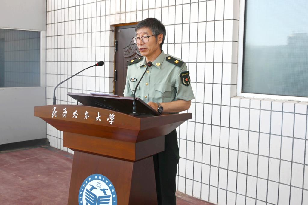 張文治作動員講話,他向承擔(dān)本次軍訓(xùn)任務(wù)的武警齊齊哈爾支隊全體官兵表示熱烈的歡迎,向擔(dān)任軍訓(xùn)任務(wù)的40名自訓(xùn)教官表示衷心感謝,向參加軍訓(xùn)的2024級全體新同學(xué)表示誠摯的慰問。他強調(diào)了大學(xué)生軍事訓(xùn)練的重要性,指出對大學(xué)生軍事訓(xùn)練是貫徹落實《國防教育法》、《兵役法》的基本要求,是全民國防意識的重要體現(xiàn),是立德樹人的重要舉措。他向全體參訓(xùn)師生提出四點希望和要求,一要樹立理想堅定信念;二要服從命令聽從指揮;三要磨練意志鍛煉品質(zhì);四要嚴(yán)守紀(jì)律鑄就榮譽;五要主動擔(dān)當(dāng)密切協(xié)同。
