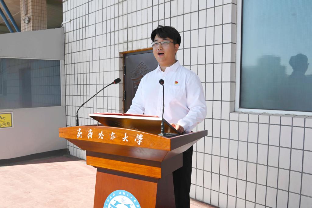 新生代表、2024級研究生、化學(xué)與化學(xué)工程學(xué)院高分子化學(xué)與物理學(xué)科楊雅琪同學(xué)發(fā)言。她與同學(xué)們分享了本科和考研準(zhǔn)備過程經(jīng)歷,她表示,在未來求學(xué)路上要制定好成長目標(biāo),以認(rèn)真嚴(yán)謹(jǐn)?shù)膽B(tài)度求知求實、以積極向上的精神求真求新,腳踏實地、勤學(xué)好問,傳承“致知、致用、致遠(yuǎn)”的齊大學(xué)風(fēng),弘揚“大愛、大道、大學(xué)”的齊大校風(fēng)。