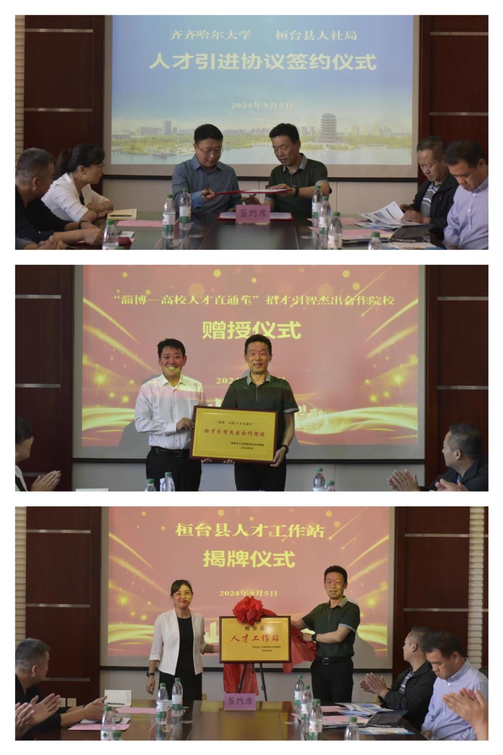 學(xué)校分別與淄博市和桓臺縣進(jìn)行校地合作簽約及授牌儀式。