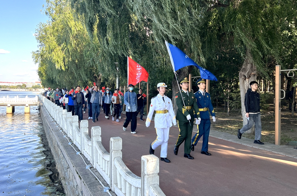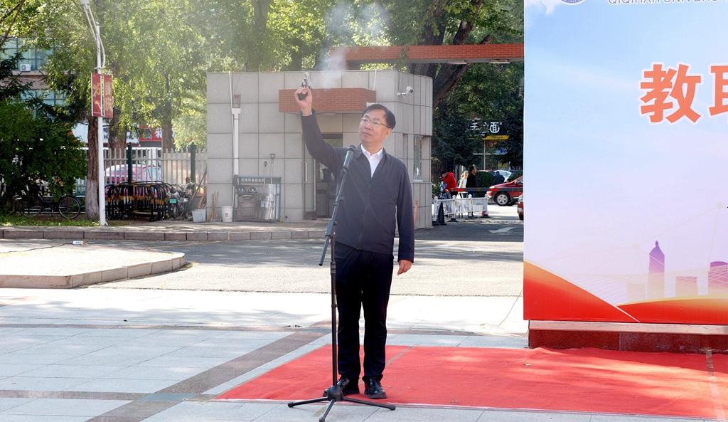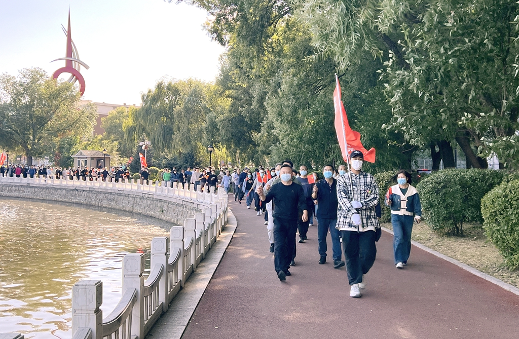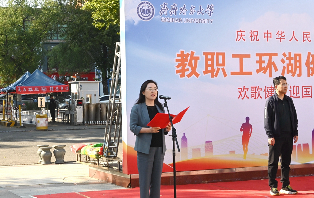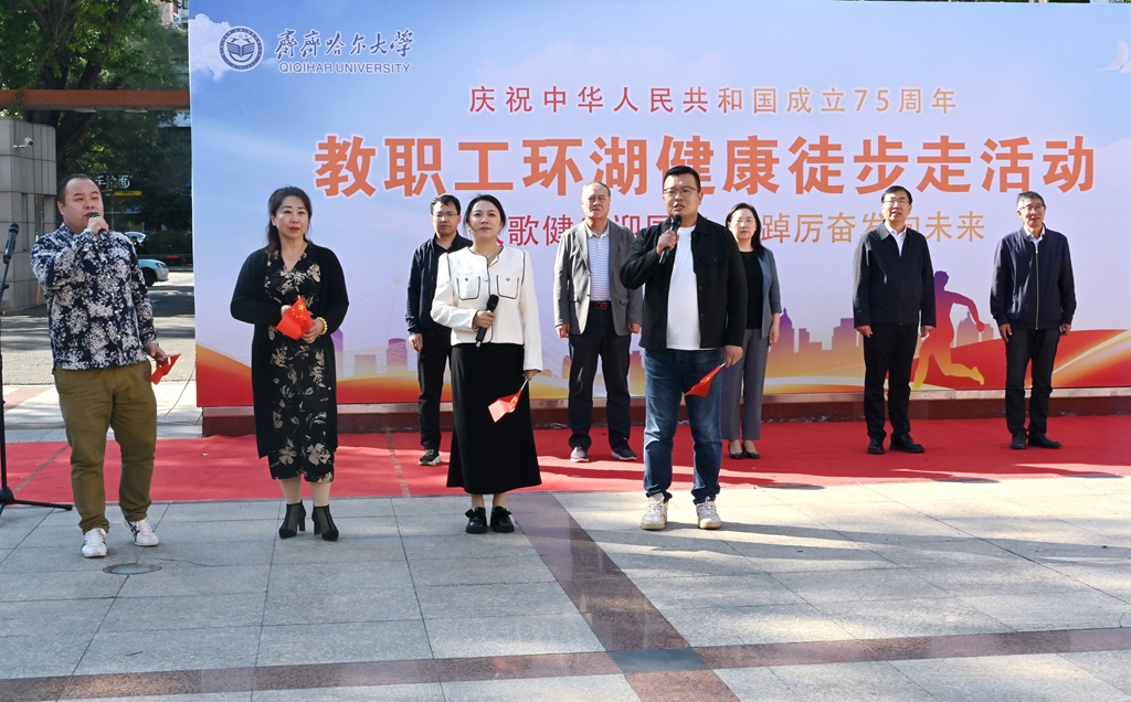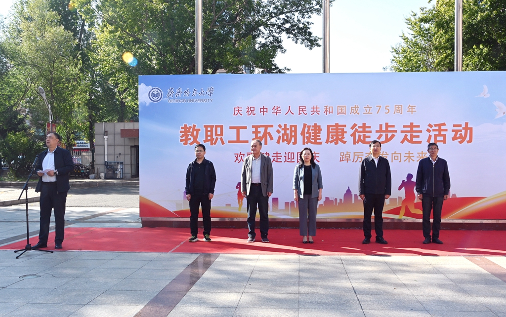 校黨委書記丁宏在致辭時指出,75年來,在中國共產(chǎn)黨的領(lǐng)導(dǎo)下,全國各族人民團(tuán)結(jié)一心、同舟共濟(jì),戰(zhàn)勝了無數(shù)艱難險阻,實現(xiàn)了從站起來、富起來到強(qiáng)起來的歷史性飛躍,中國特色社會主義進(jìn)入新時代。有著72年辦學(xué)歷史的齊齊哈爾大學(xué)坐落于勞動湖畔,素有“環(huán)湖大學(xué)”的美譽(yù),這一池碧水見證了學(xué)校的發(fā)展和變遷,也為巍巍學(xué)府增添了無限的秀美與靈氣。教職工環(huán)湖健康徒步走是我校傳統(tǒng)特色體育活動,深受教職工的歡迎。希望廣大教職工在此次健步走活動中,欣賞勞動湖畔秋日的美景,感受健康運(yùn)動帶來的身心愉悅,在集體活動中增強(qiáng)凝聚力,在攜手并肩前行中增進(jìn)團(tuán)結(jié),進(jìn)一步激發(fā)愛校榮校、愛崗敬業(yè)、攻堅奮進(jìn)的精神動力,爭做學(xué)校高質(zhì)量發(fā)展的參與者、推動者、宣傳者。