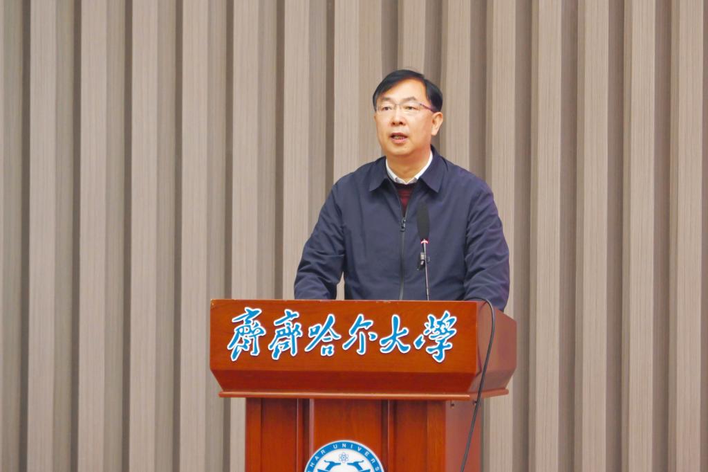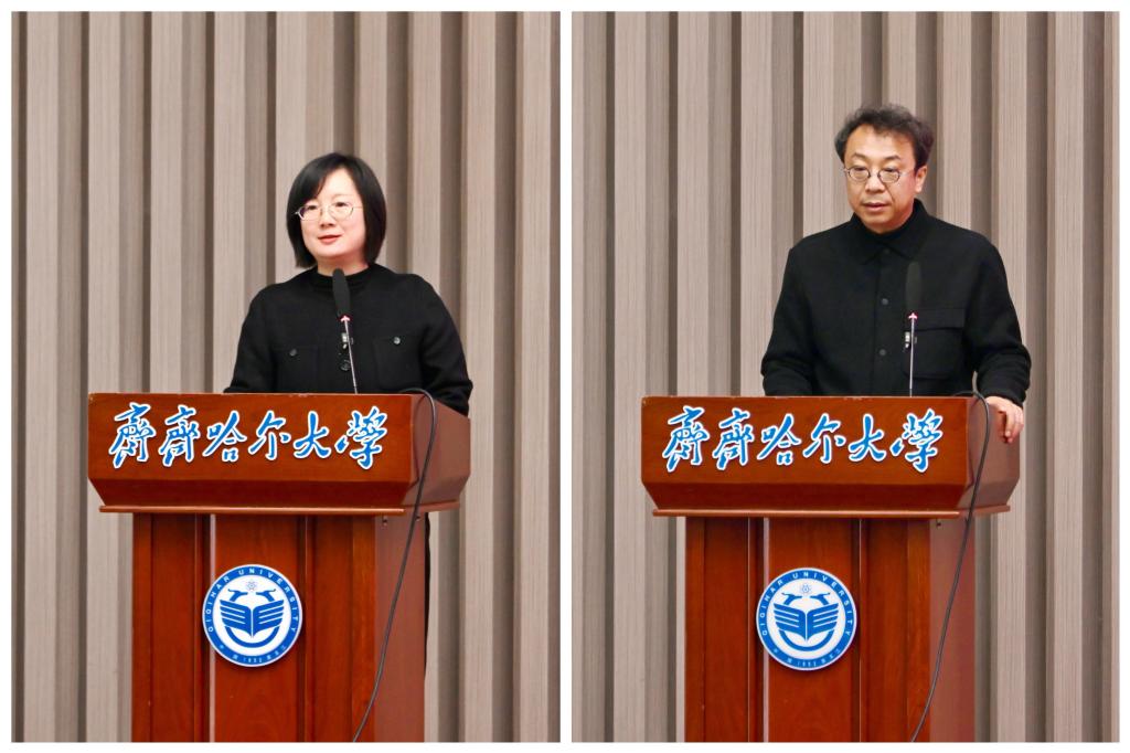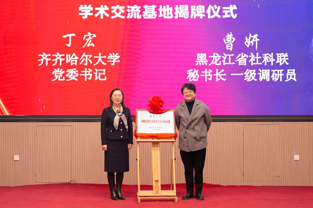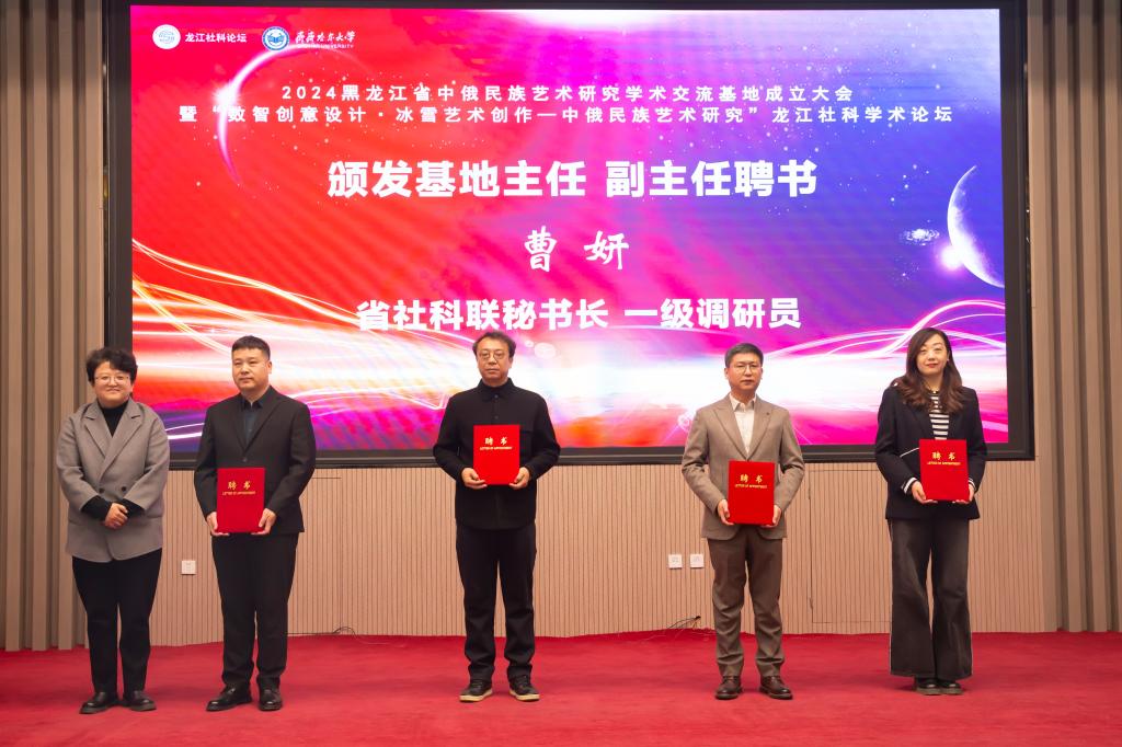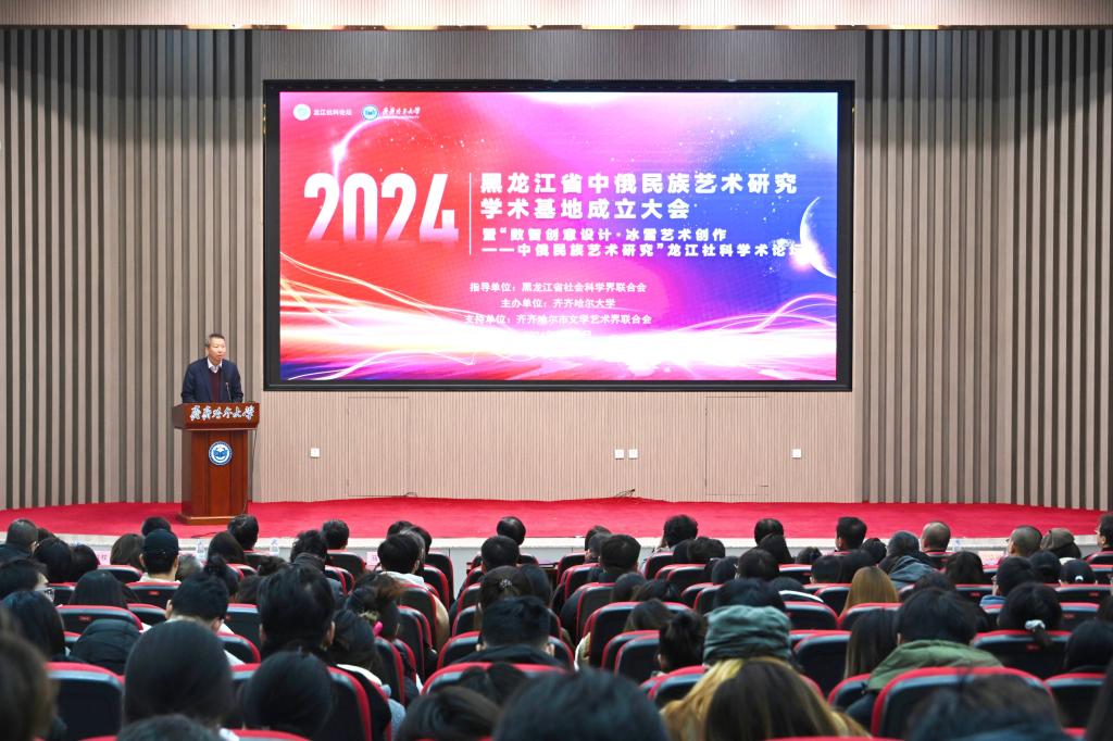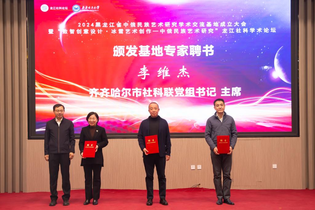 郝文斌在致詞中指出,近年來,齊齊哈爾大學(xué)立足服務(wù)我省“4567”現(xiàn)代化產(chǎn)業(yè)體系建設(shè),加強(qiáng)有組織科研頂層設(shè)計(jì),以科技創(chuàng)新助力發(fā)展新質(zhì)生產(chǎn)力,在推動發(fā)展生物經(jīng)濟(jì)、創(chuàng)意設(shè)計(jì)等產(chǎn)業(yè)方面取得代表性成果,為龍江振興發(fā)展提供了人才與技術(shù)支持。“省中俄民族藝術(shù)研究學(xué)術(shù)交流基地”落戶我校,是省社科聯(lián)對我校的信任和支持,是對我校中俄民族藝術(shù)研究相關(guān)學(xué)科建設(shè)的充分肯定,對于提升我校民族學(xué)術(shù)研究、學(xué)術(shù)交流層次,擴(kuò)大學(xué)術(shù)影響力、推動相關(guān)學(xué)科發(fā)展具有重要意義。齊齊哈爾大學(xué)將認(rèn)真貫徹許勤書記調(diào)研我校時對校地共建齊齊哈爾創(chuàng)意設(shè)計(jì)港有關(guān)指示要求,落實(shí)《黑龍江省創(chuàng)意設(shè)計(jì)產(chǎn)業(yè)發(fā)展專項(xiàng)規(guī)劃(2022-2030年)》《黑龍江省支持創(chuàng)意設(shè)計(jì)產(chǎn)業(yè)發(fā)展若干政策措施》等文件精神,在省社科聯(lián)指導(dǎo)下,持續(xù)加強(qiáng)同省內(nèi)兄弟高校和齊齊哈爾市社科聯(lián)、市文聯(lián)以及省市藝術(shù)設(shè)計(jì)研究創(chuàng)作力量的聯(lián)系協(xié)作,有力有效推進(jìn)“環(huán)齊齊哈爾大學(xué)創(chuàng)新創(chuàng)業(yè)生態(tài)圈”建設(shè),助力我省創(chuàng)意設(shè)計(jì)產(chǎn)業(yè)發(fā)展,積極參與齊齊哈爾創(chuàng)意設(shè)計(jì)港建設(shè),為豐富跨境文化藝術(shù)研究成果,助力向北開放新高地建設(shè)、龍江高質(zhì)量發(fā)展、可持續(xù)振興貢獻(xiàn)智慧和力量。