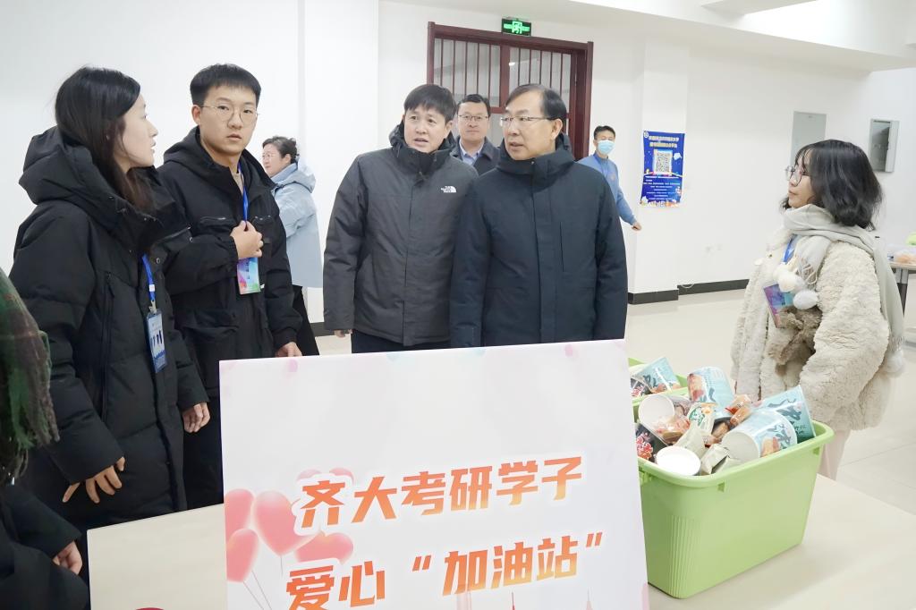郝文斌代表學校向考研學生表示關(guān)懷和慰問,對學生備考過程中所表現(xiàn)出齊大人拼搏進取、昂揚向上的精神表示肯定和贊揚。他細致詢問了同學們的院校報考、學習狀態(tài)和生活狀況,勉勵考研學子“路雖遠行則將至,事雖難做則必成”要注意勞逸結(jié)合、科學調(diào)整復習策略,樂觀積極迎接大考,并預祝同學們金榜題名,一戰(zhàn)成“碩”。在走訪慰問過程中,郝文斌還仔細查看了考研自習室的學習環(huán)境和條件保障,他強調(diào)各部門要多措并舉、全員聯(lián)動、凝聚合力,積極創(chuàng)造條件為考研學生提供全面、優(yōu)質(zhì)的服務(wù)和保障,積極教育引導好考研學生以理性平和心態(tài)迎接“大考”。