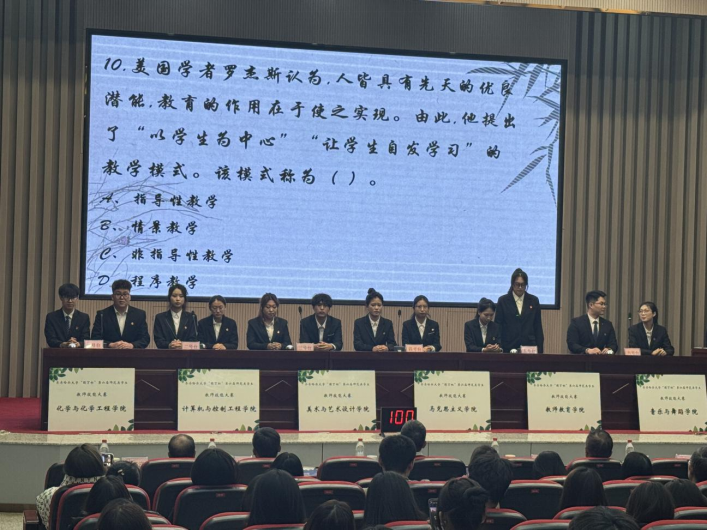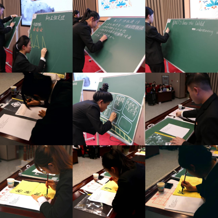 決賽分為個(gè)人三筆字書寫、板書設(shè)計(jì)、說課與講課技能比賽,學(xué)院團(tuán)體知識競答兩個(gè)部分。經(jīng)過角逐,理學(xué)院賈國瑩獲一等獎(jiǎng),馬克思主義學(xué)院韓彤獲二等獎(jiǎng),化學(xué)與化學(xué)工程學(xué)院徐陽陽獲三等獎(jiǎng),其余6名同學(xué)獲優(yōu)秀獎(jiǎng);教師教育學(xué)院獲團(tuán)體一等獎(jiǎng),美術(shù)與藝術(shù)設(shè)計(jì)學(xué)院獲團(tuán)體二等獎(jiǎng),化學(xué)與化學(xué)工程學(xué)院獲團(tuán)體三等獎(jiǎng),馬克思主義學(xué)院、計(jì)算機(jī)與控制工程學(xué)院、音樂與舞蹈學(xué)院獲團(tuán)體優(yōu)秀獎(jiǎng),9名指導(dǎo)教師獲“優(yōu)秀指導(dǎo)教師”獎(jiǎng)。