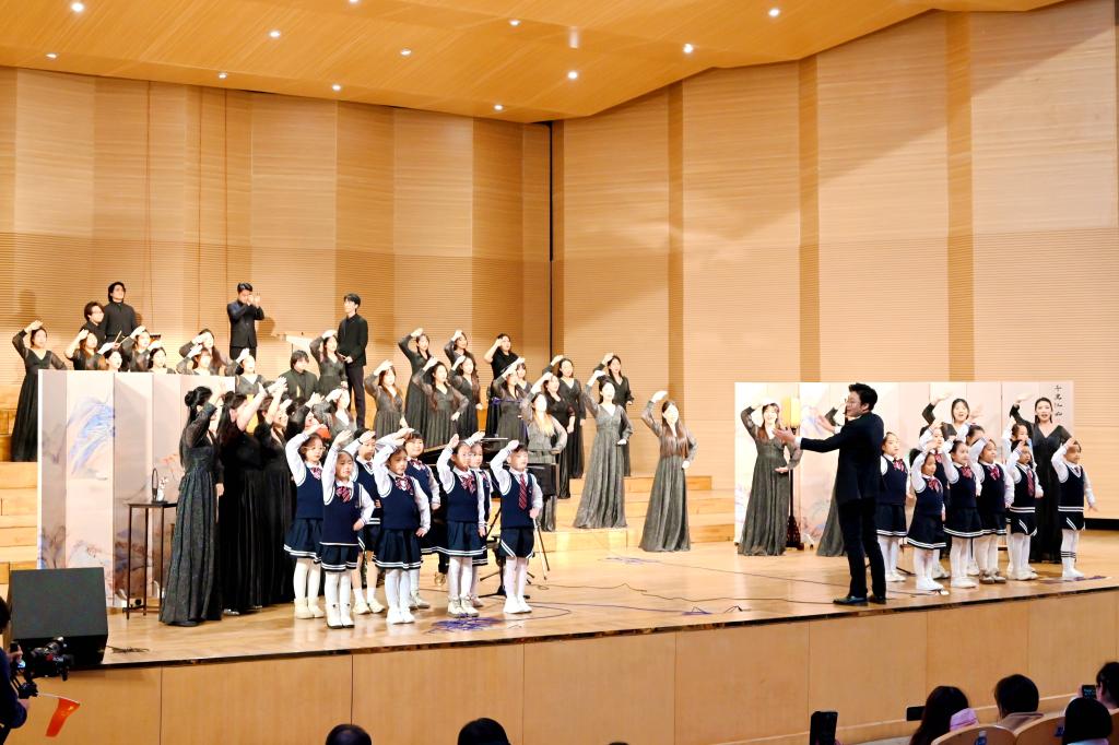 音樂會在中國古代文學(xué)源頭《詩經(jīng)》中《小雅·鹿鳴》的合唱聲中拉開帷幕,齊大合唱團和育紅小學(xué)童聲合唱團配合默契,相得益彰,空靈清澈的歌聲和禮儀表演,盡顯西周禮樂文化的古樸典雅,這也是學(xué)校大中小學(xué)思想政治一體化建設(shè)的成果展示。