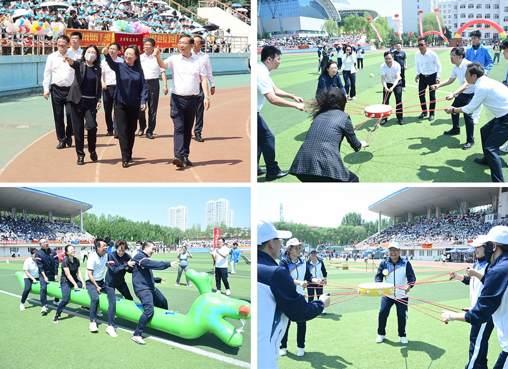 開幕式上,校工會精心組織的教職工集體趣味項目“旱地龍舟”和“同心鼓”精彩上演。教師們齊心協(xié)力,在“左右左”的口號聲中駕馭彩色“龍舟”破浪前行,在鼓點與排球共舞的韻律中展現(xiàn)默契配合。校領(lǐng)導(dǎo)也走進(jìn)賽場與教職工一同參與游戲,歡聲笑語間,師者風(fēng)采與團(tuán)隊精神相得益彰,在校領(lǐng)導(dǎo)帶頭參與的示范下,書寫了校園文化建設(shè)“上下同心” 的生動篇章。
