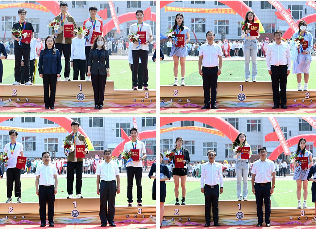 校領(lǐng)導(dǎo)作為頒獎嘉賓,分別為開幕式前舉行的男子一萬米、女子五千米等項目獲得者頒獎,并環(huán)場一周慰問師生,送上鼓勵與關(guān)懷。