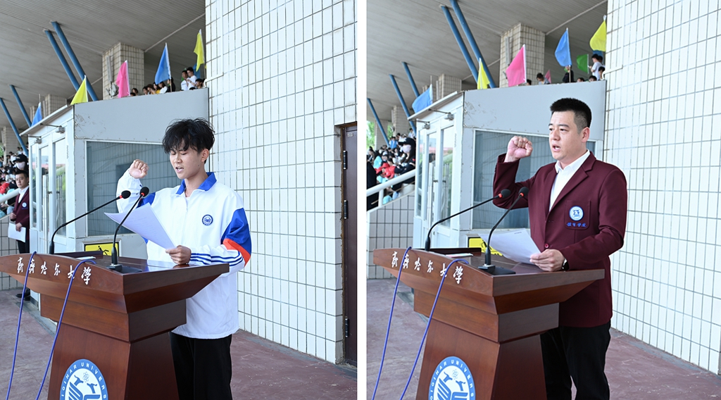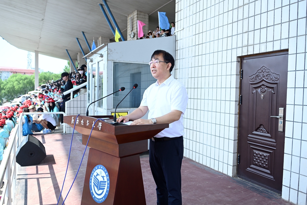 校長、黨委副書記郝文斌致開幕詞,他指出,學(xué)校深入貫徹習(xí)近平總書記關(guān)于體育的重要論述,全面貫徹黨的教育方針,高度重視體育工作,積極開展豐富活動提升師生身體素質(zhì)與健康水平。新時代新征程,學(xué)校以加快建設(shè)體育強(qiáng)國為指引,堅持“健康第一”教育理念,構(gòu)建“五育并舉”育人體系,善用科技賦能體育,助力師生在體育運動中享受樂趣、增強(qiáng)體質(zhì)、錘煉意志,追求卓越競技精神。希望全校師生將“頑強(qiáng)拼搏、超越自我”的體育精神融入日常,在實現(xiàn)個人夢想與民族復(fù)興的同頻共振中,書寫屬于新時代齊大人的華彩樂章!