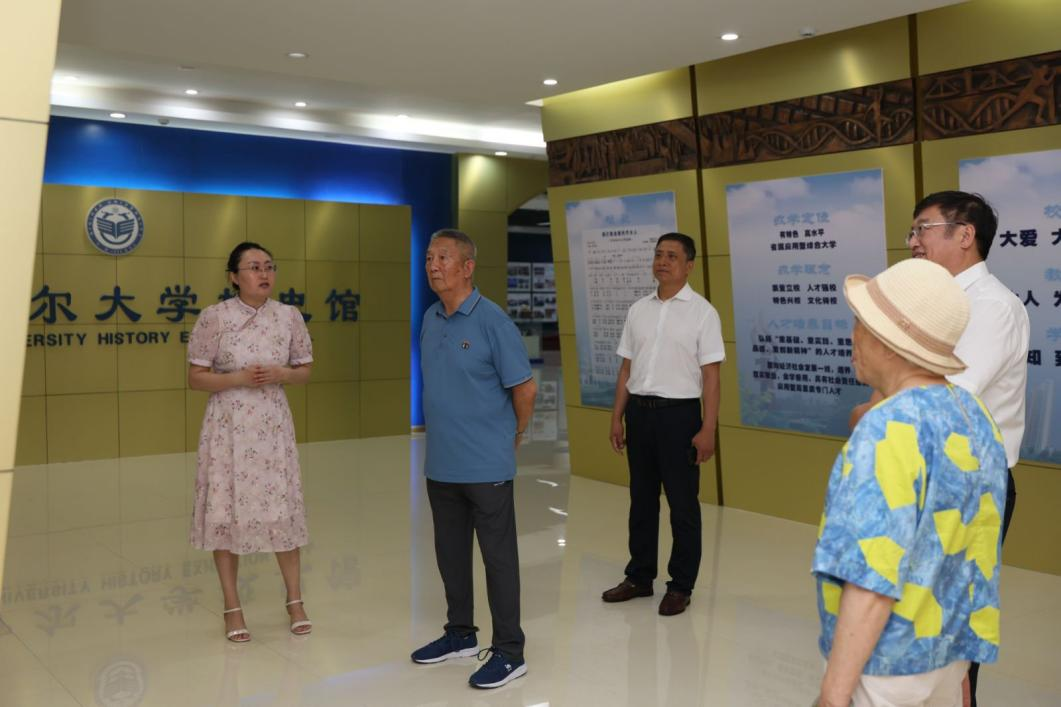 在校史館內(nèi),楊新人先生駐足于記載學(xué)校早期發(fā)展的展區(qū),仔細(xì)察看歷史照片與實(shí)物展品,不時(shí)與陪同人員分享當(dāng)年執(zhí)教時(shí)的細(xì)節(jié)往事,既有高分子化學(xué)課堂教學(xué),又有平房實(shí)驗(yàn)室的實(shí)驗(yàn)教學(xué)等各種場(chǎng)景,言語(yǔ)間流露對(duì)過(guò)往歲月的懷念及對(duì)學(xué)校發(fā)展的深切關(guān)懷。臨行前,楊新人先生揮筆寫(xiě)下“北國(guó)高校之花”的留言,以簡(jiǎn)潔精辟的文字表達(dá)對(duì)學(xué)校辦學(xué)成果的高度認(rèn)可和深情寄語(yǔ),希望學(xué)校能繼續(xù)守護(hù)好傳統(tǒng)優(yōu)勢(shì)學(xué)科的根基,讓老專(zhuān)業(yè)煥發(fā)新活力,培養(yǎng)更多扎根東北、服務(wù)地方的優(yōu)秀人才,努力創(chuàng)建特色鮮明的高水平大學(xué)。