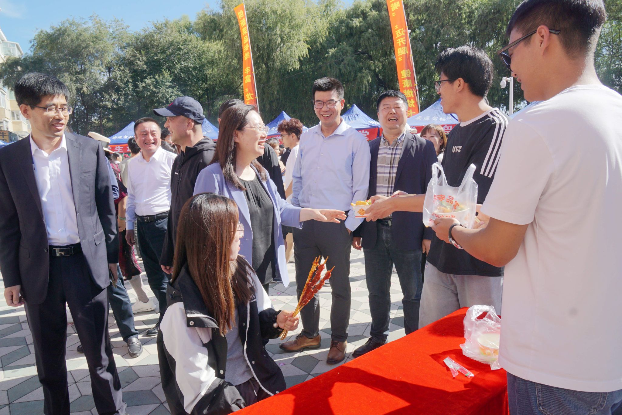 校黨委書記丁宏宣布第四屆校園美食展銷節(jié)活動啟動,校領(lǐng)導(dǎo)與嘉賓共同為師生分發(fā)蛋糕,送上美好祝福。