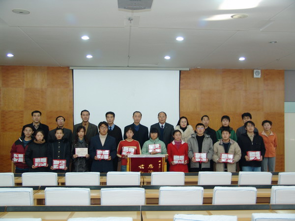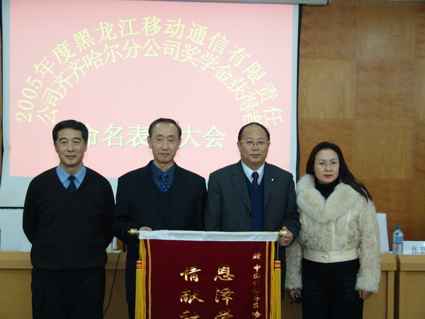 命名表彰大會上,副校長姜守訓宣讀了《齊齊哈爾大學關于命名表彰2005年度“黑龍江移動通信有限責任公司齊齊哈爾分公司獎學金”獲得者的決定》;校領導及嘉賓分別為該項獎學金獲得者代表頒發(fā)了證書和獎金;校長唱江華、副校長姜守訓代表學校向黑龍江移動通信有限責任公司齊齊哈爾分公司總經(jīng)理董向輝、副總經(jīng)理張富敏贈送了寫有“恩澤學子顯風采,情獻社會譜新篇”的錦旗。