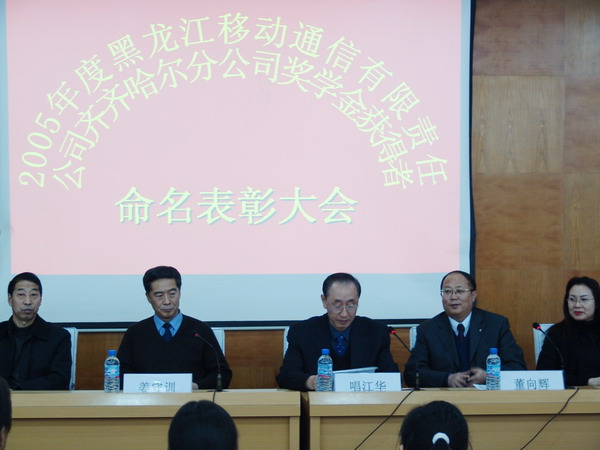 12月15日下午,2005年度“黑龍江移動通信有限責任公司齊齊哈爾分公司獎學金獲得者”命名表彰大會在我校西區(qū)主樓報告廳隆重舉行,校長唱江華、副校長姜守訓、黑龍江移動通信有限責任公司齊齊哈爾分公司總經(jīng)理董向輝、副總經(jīng)理張富敏等出席,學生處(學工部)長王剛主持大會。