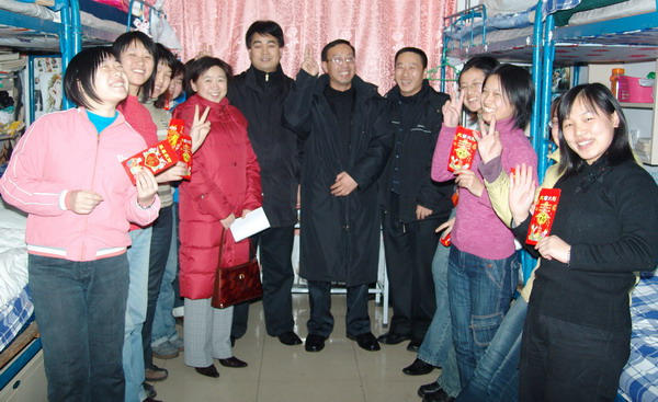 2006年1月26日晚,校學生處副處長吳寶柱與學生資助科科長張培華、舍務科科長王國義、學生資助科李靜老師等帶著學校領導的親切囑托來到4#、14#、15#學生公寓,看望并慰問在春節(jié)期間留校度寒假的大學生。 學生處有關人員一行向在春節(jié)期間留校度寒假的大學生轉(zhuǎn)達了學校領導的關懷與慰問之情,向他們致以節(jié)日的祝福。