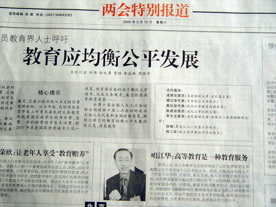 圍繞非義務(wù)教育投入問題,唱江華校長在黑龍江省代表團(tuán)舉行的第一次全體會(huì)議上做了發(fā)言。他建議,非義務(wù)教育階段助學(xué)貸款和特困生的補(bǔ)助應(yīng)由中央政府、地方政府共同投資,由民政部門在學(xué)生入學(xué)前做好貸款或補(bǔ)助認(rèn)定。2005年3月6日的《黑龍江日報(bào)》予以了報(bào)道。