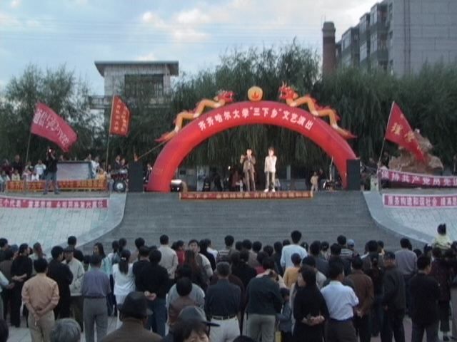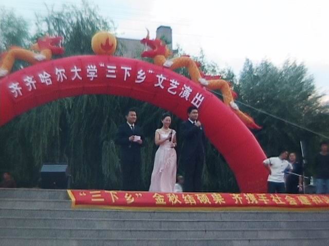9月5日上午,社會(huì)實(shí)踐服務(wù)團(tuán)師生不顧一路顛簸勞累,在到達(dá)泰來縣江橋鎮(zhèn)后即在江橋鎮(zhèn)馬占山抗日紀(jì)念公園舉行了“緬懷先烈,牢記歷史”愛國主義主題教育活動(dòng),聽取了王東升老同志的關(guān)于江橋抗戰(zhàn)革命歷史知識(shí)介紹。齊齊哈爾市關(guān)工委副主任崔文杰、察廣信、甘文耀,泰來縣縣委副書記郭宇航、副縣長馬志海、團(tuán)縣委書記劉立偉、江橋鎮(zhèn)鎮(zhèn)長李洪宇等出席活動(dòng);同時(shí),社會(huì)服務(wù)團(tuán)資助了泰來縣江橋鎮(zhèn)中學(xué)5名貧困學(xué)生,為江橋鎮(zhèn)捐贈(zèng)衣物600余件;開展了義診并贈(zèng)送藥品。晚18:30,社會(huì)實(shí)踐服務(wù)團(tuán)師生在泰來縣中心廣場開展“再攜手,共建和諧”大型廣場文藝演出。泰來縣委、縣人大、縣政府、縣政協(xié)及相關(guān)部門領(lǐng)導(dǎo)和社會(huì)各界群眾千余人觀看了精彩的文藝演出。我校大學(xué)生社會(huì)實(shí)踐服務(wù)團(tuán)成員與泰來縣群眾一起同臺(tái)表演,活躍了氣氛,增進(jìn)了友誼。我校學(xué)生表演的歌曲《跟黨走》、舞蹈《月光下的鳳尾竹》等精彩的文藝節(jié)目博得了現(xiàn)場的泰來縣廣大人民群眾的熱烈掌聲。熱情洋溢的掌聲,進(jìn)一步激發(fā)了廣大同學(xué)更好地開展“三下鄉(xiāng)”活動(dòng)的信心;人民群眾的鼓勵(lì),更加堅(jiān)定了同學(xué)們踐行“三個(gè)代表”重要思想的決心。