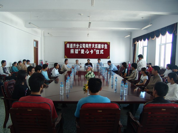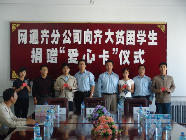 9月14日下午1時,中國網(wǎng)通齊齊哈爾分公司向貧困學(xué)生捐贈"愛心卡"的儀式在我校西區(qū)主樓606會議室舉行。齊齊哈爾通信分公司副總經(jīng)理李巖、齊齊哈爾通信分公司瀏園分局局長劉松濤、副局長高宏偉、閆偉,我校學(xué)生處處長王剛、副處長吳寶柱及相關(guān)工作人員與來自各學(xué)院的30名貧困生代表參加了儀式。