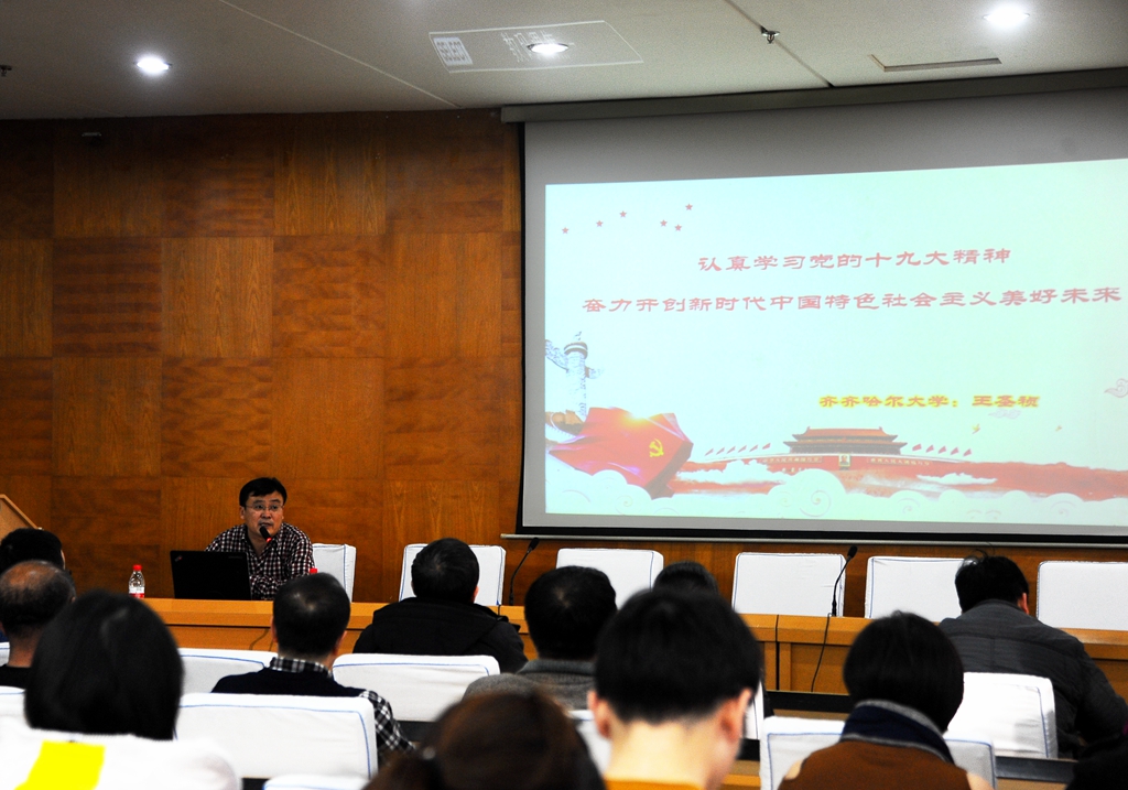 會上,王圣禎教授以《奮力開創(chuàng)新時代中國特色社會主義美好未來》為題,從黨的十九大主題和主要成果、中國特色社會主義進入新時代、新時代中國特色社會主義的主要矛盾、新時代中國特色社會主義的歷史使命、新時代中國特色社會主義的理論指導、新時代中國特色社會主義的戰(zhàn)略目標、新時代中國特色社會主義的戰(zhàn)略部署、新時代中國特色社會主義的堅強領導等八個方面,對黨的十九大精神進行了系統(tǒng)解讀。