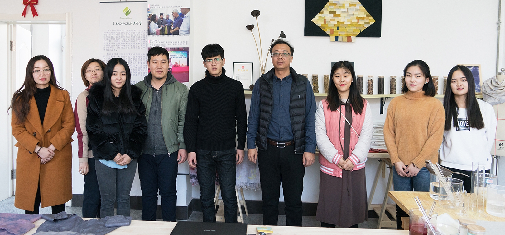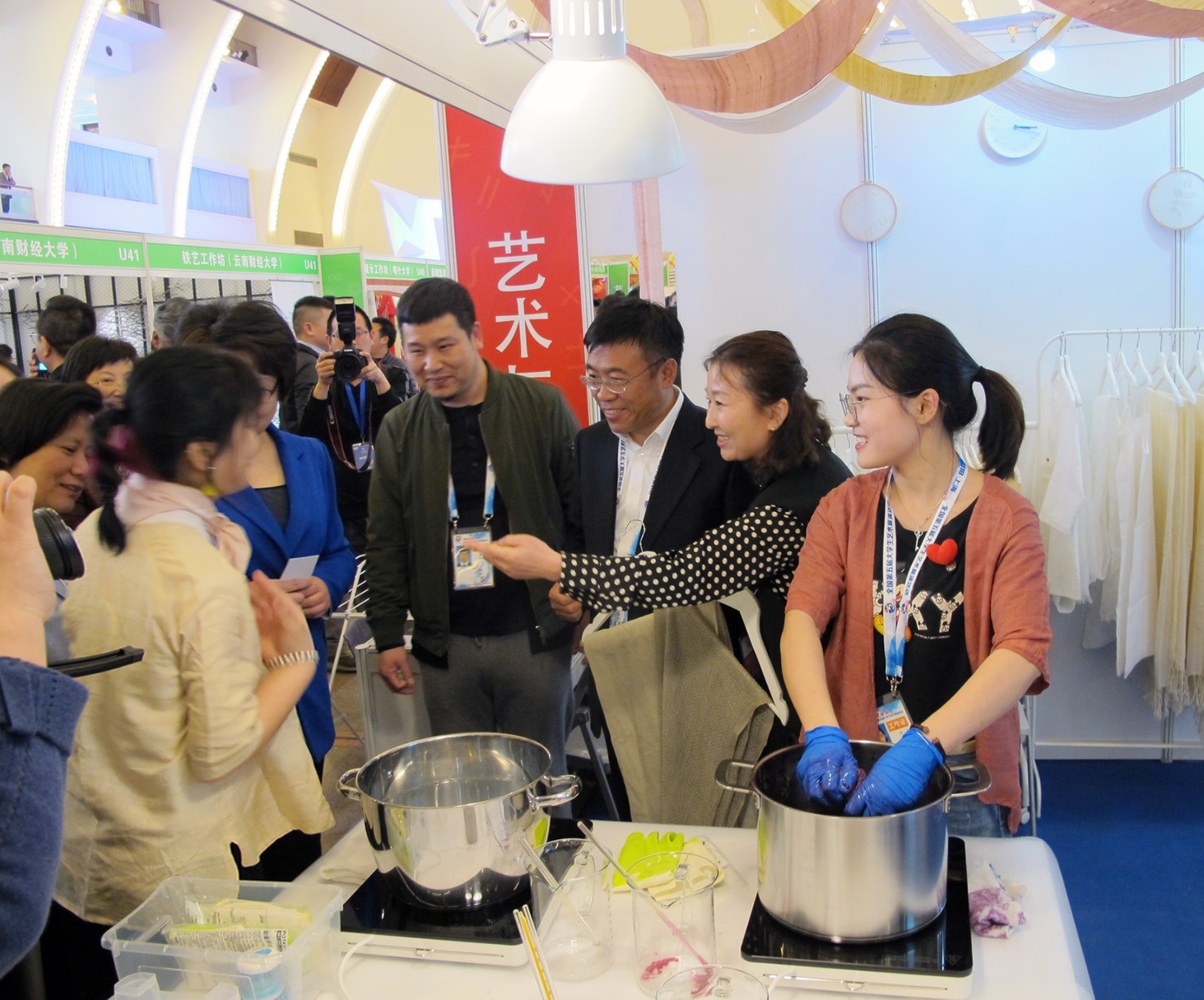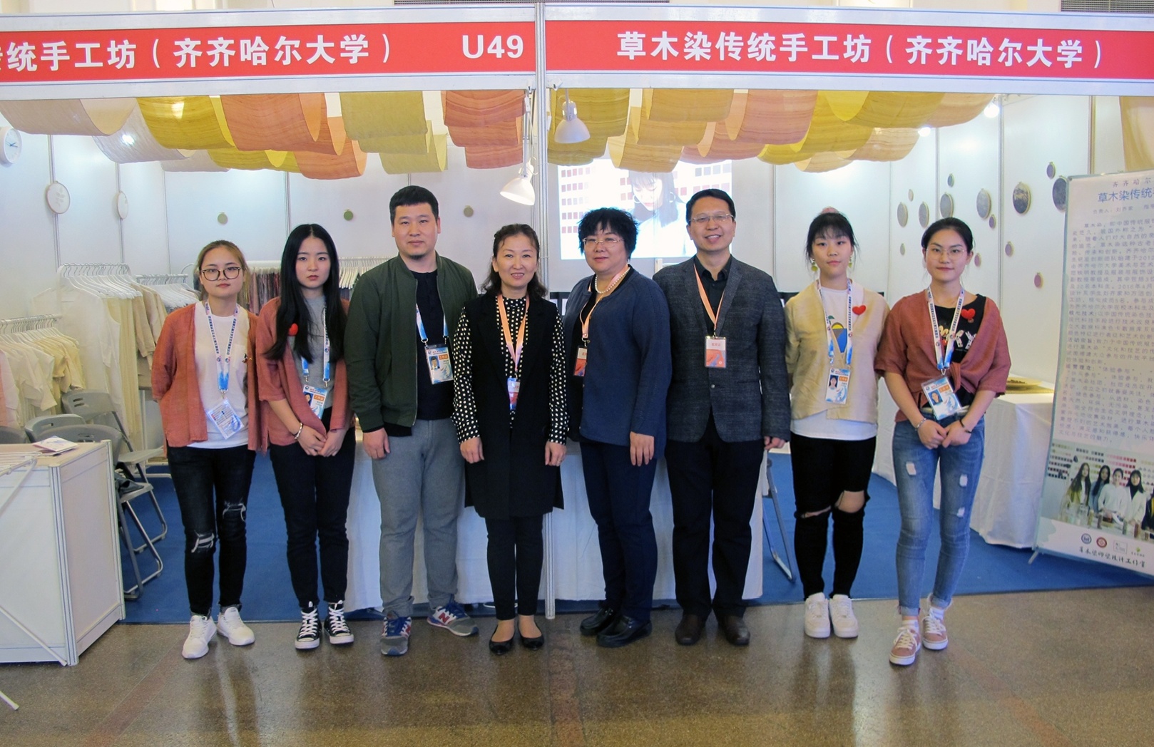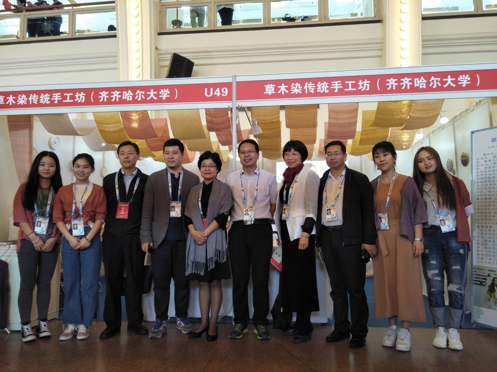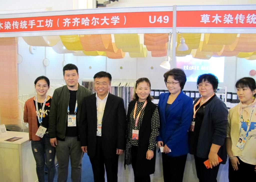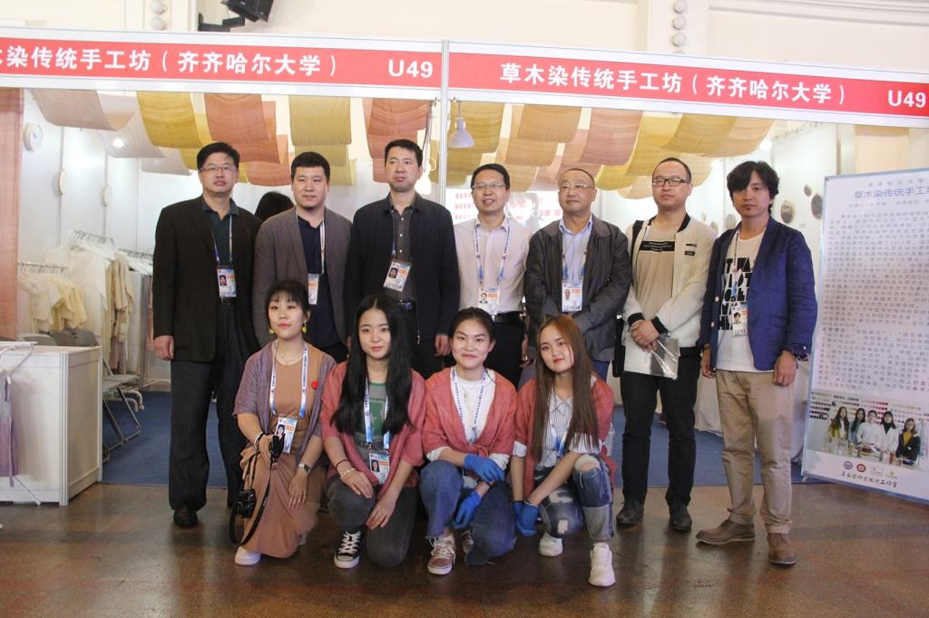 草木染傳統(tǒng)工作坊是在“文化鑄校”科學(xué)理念指導(dǎo)下我校大學(xué)生研發(fā)創(chuàng)新團(tuán)隊(duì)于2012年建立的。該團(tuán)隊(duì)主要由齊齊哈爾大學(xué)美術(shù)與藝術(shù)設(shè)計學(xué)院副院長范鐵明教授、服裝與服飾設(shè)計系趙志軍副教授等組成,團(tuán)隊(duì)多年來以中國傳統(tǒng)染色技藝為基礎(chǔ),利用現(xiàn)代科技手段進(jìn)行技術(shù)改良和創(chuàng)新。通過建立大數(shù)據(jù)標(biāo)準(zhǔn)色卡數(shù)據(jù)庫系統(tǒng),對紡織品的顏色特征進(jìn)行大膽的藝術(shù)創(chuàng)新實(shí)踐。以全產(chǎn)業(yè)鏈整合連鎖、生物酶高效生化色素萃取、大數(shù)據(jù)標(biāo)準(zhǔn)色卡數(shù)據(jù)庫系統(tǒng)、分子生物學(xué)復(fù)合改性與表征、傳統(tǒng)技藝現(xiàn)代仿真為創(chuàng)新點(diǎn),在天然染料方面為消費(fèi)者提供安全環(huán)保的紡織物。通過多年的技藝革新與大量的創(chuàng)新實(shí)踐,目前已經(jīng)形成了成熟的草木染技藝。2017年6月,草木染團(tuán)隊(duì)參加第十五屆“挑戰(zhàn)杯”黑龍江省大學(xué)生課外學(xué)術(shù)科技作品競賽決賽,榮獲一等獎、最具市場潛力獎、最佳人氣作品獎三個獎項(xiàng)。2017年8月,該團(tuán)隊(duì)獲得黑龍江省第五屆大學(xué)生藝術(shù)展演(藝術(shù)工作坊)二等獎。同年5月和8月,草木染研發(fā)創(chuàng)新團(tuán)隊(duì)先后參加深圳文博會和第十二屆黑龍江國際文化產(chǎn)業(yè)博覽會,并順利與企業(yè)簽約進(jìn)行全產(chǎn)業(yè)鏈合作。此次借助大藝展的平臺,我校的草木染傳統(tǒng)手工坊進(jìn)一步走出黑龍江省,走向了全國,讓更多的人熟悉和喜愛,所有參演師生都充滿欣喜,倍感振奮。而欣喜與振奮之余,通過與全國各參展單位的交流,參演師生有了更多更深的思考,就是在新時代如何將草木染的成果更快更好地與現(xiàn)實(shí)生活緊密結(jié)合,不斷滿足日益增長的美好生活需要。更新發(fā)展理念,開拓審美視野,增長技藝見識,擴(kuò)大友好交流,此次大藝展使齊齊哈爾大學(xué)參展師生收獲頗豐。