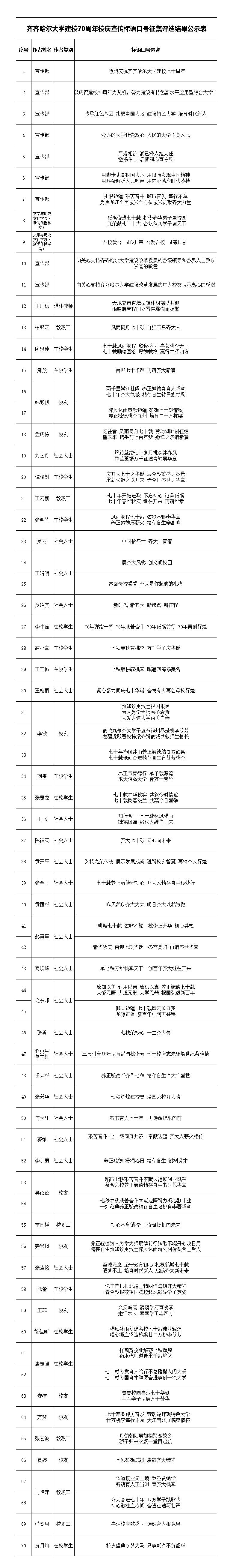 為喜迎齊齊哈爾大學建校70周年,弘揚“養(yǎng)正毓德 精存自生”的校訓精神,深刻熔煉學校的辦學理念、歷史文化、優(yōu)良傳統(tǒng)、精神品格、成就特色,鼓舞激勵全校師生繼承傳統(tǒng),開創(chuàng)未來,學校于2022年3月16日正式向校內(nèi)外發(fā)布了《齊齊哈爾大學關于征集建校70周年校慶宣傳標語口號的通知》。截至2022年4月16日,收到在校學生、在校教職工、離退休教職工、校友、社會人士145人的投稿,共征集到原創(chuàng)的宣傳標語口號投稿823條。學校進行了認真的整理,成立校慶宣傳標語口號評審小組,進行了匿名評審,共評選出具有鮮明齊大特色、含義深刻、振奮精神、鼓舞人心的入圍宣傳標語口號70條。具體內(nèi)容如下: