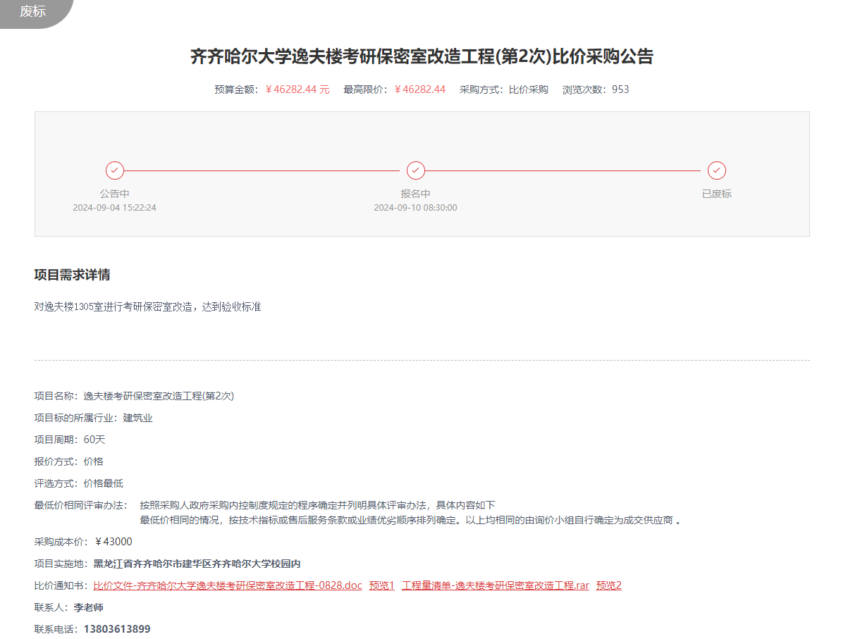 上一條:齊齊哈爾大學逸夫樓考研保密室改造工程(第3次)比價采購公告(轉(zhuǎn)自黑龍江省政府采購網(wǎng))