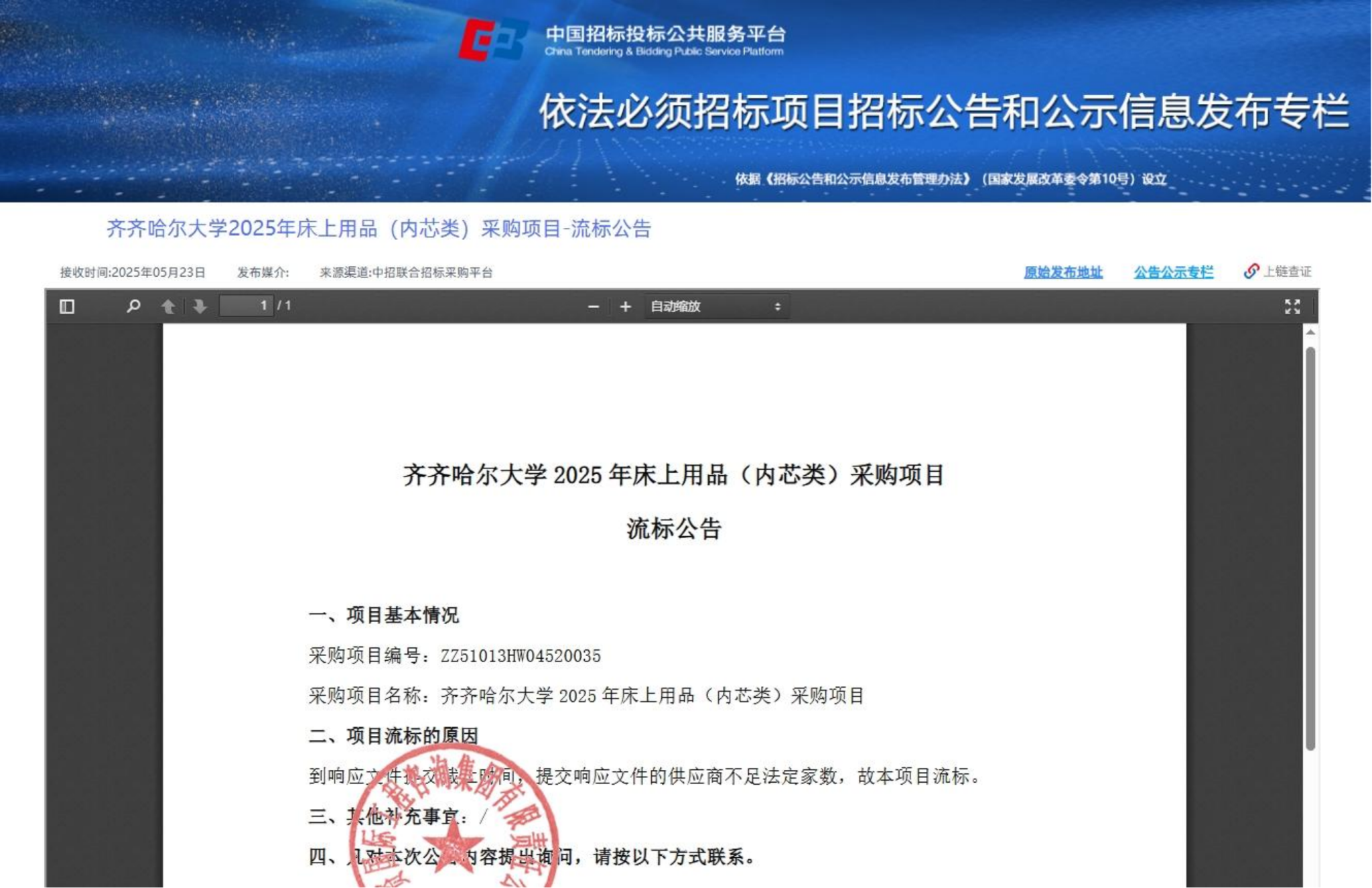 下一條:齊齊哈爾大學(xué)2025年床上用品(單罩類)采購項(xiàng)目-流標(biāo)公告(轉(zhuǎn)自中國招標(biāo)投標(biāo)公共服務(wù)平臺(tái))