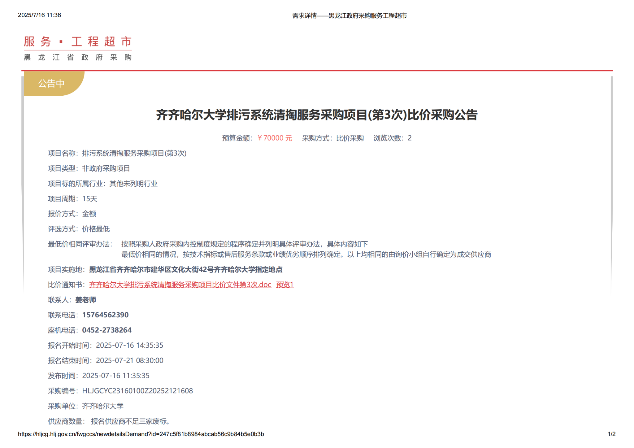 上一條:齊齊哈爾大學(xué)排污系統(tǒng)清掏服務(wù)采購項(xiàng)目(第3次)比價(jià)采購公告(取消)(轉(zhuǎn)自黑龍江省政府采購網(wǎng))