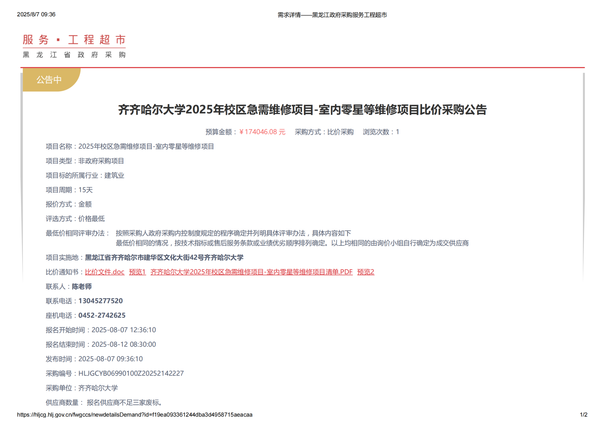 下一條:齊齊哈爾大學(xué)2025年消防系統(tǒng)維修改造項(xiàng)目中標(biāo)(成交)結(jié)果公告(轉(zhuǎn)自黑龍江省政府采購網(wǎng))