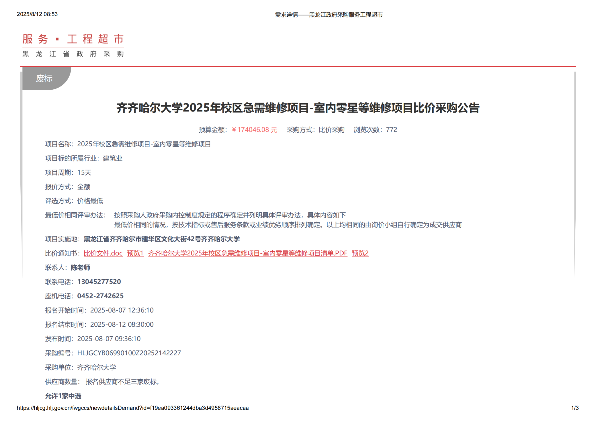 下一條:齊齊哈爾大學校門門衛(wèi)及樓宇安保服務外包項目中標(成交)結果公告(轉自黑龍江省政府采購網)