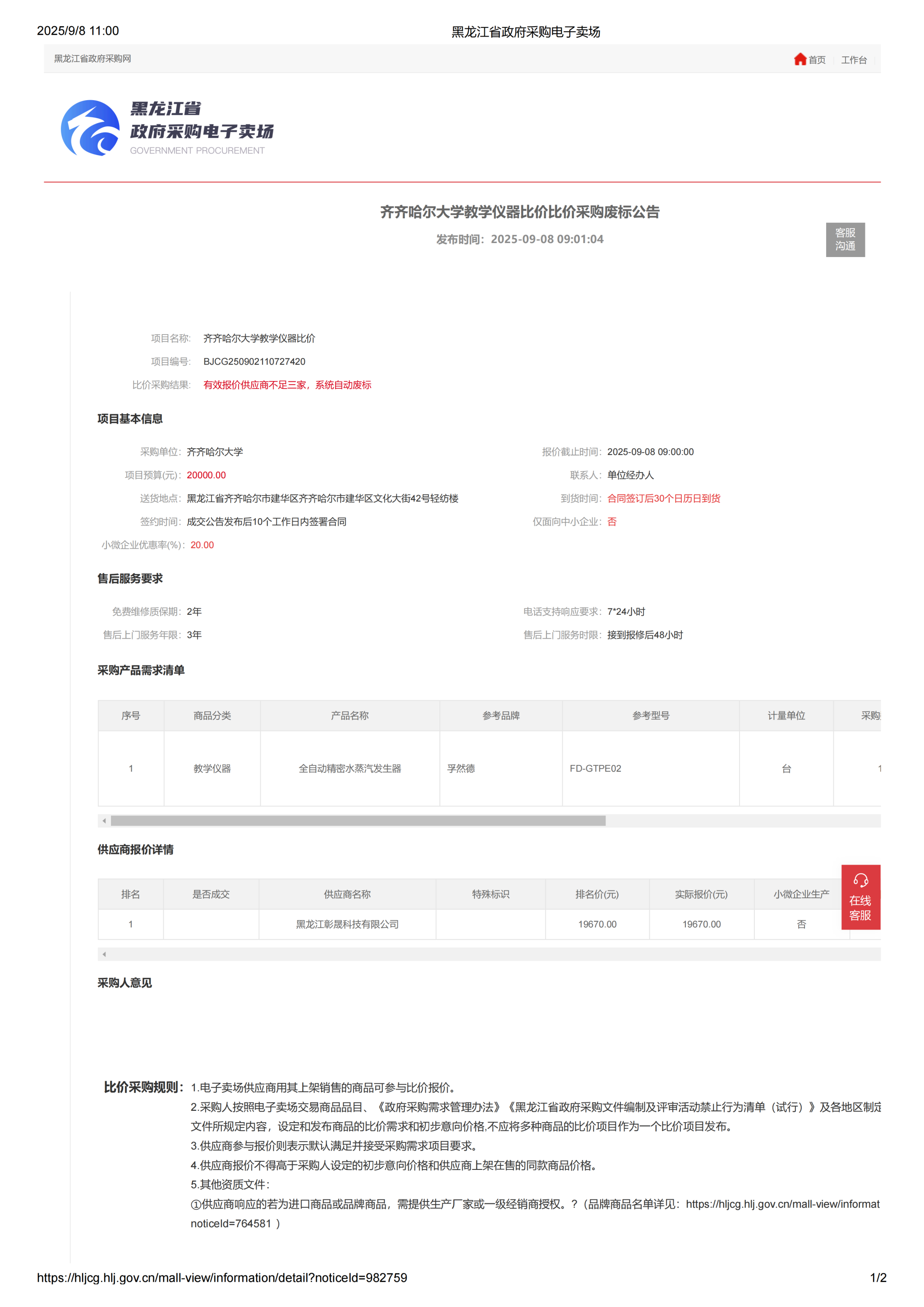 下一條:齊齊哈爾大學(xué)教學(xué)儀器比價(jià)采購(gòu)廢標(biāo)公告(轉(zhuǎn)自黑龍江省政府采購(gòu)網(wǎng))