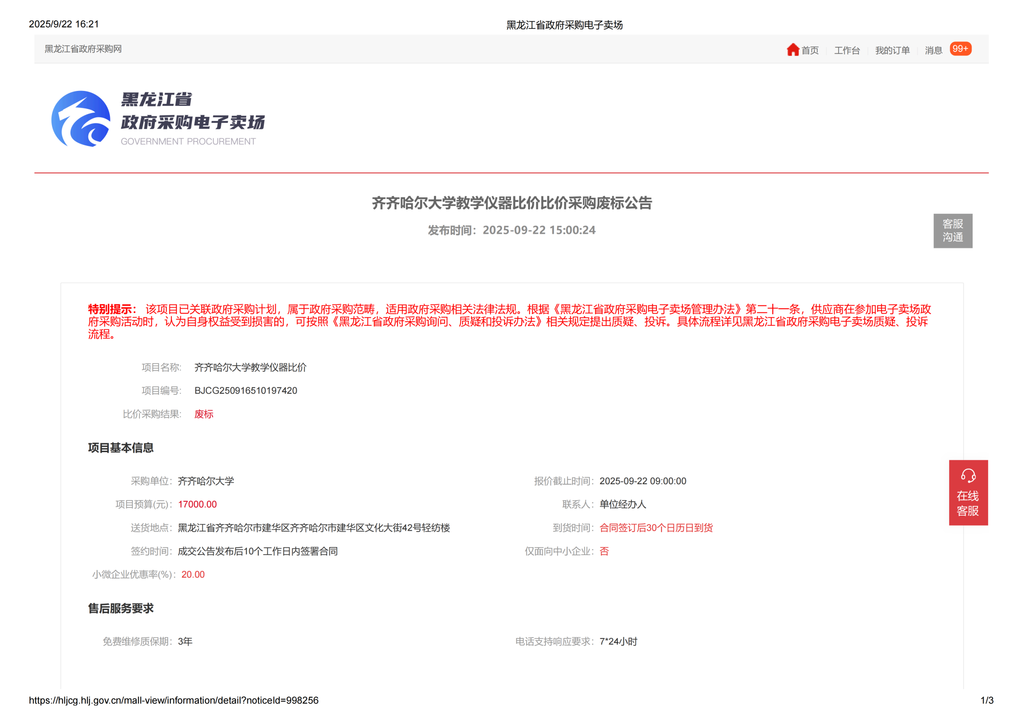 下一條:齊齊哈爾大學(xué)教學(xué)儀器比價(jià)采購成交公告(三次)(轉(zhuǎn)自黑龍江省政府采購網(wǎng))