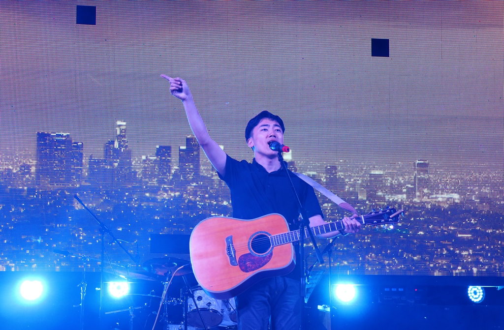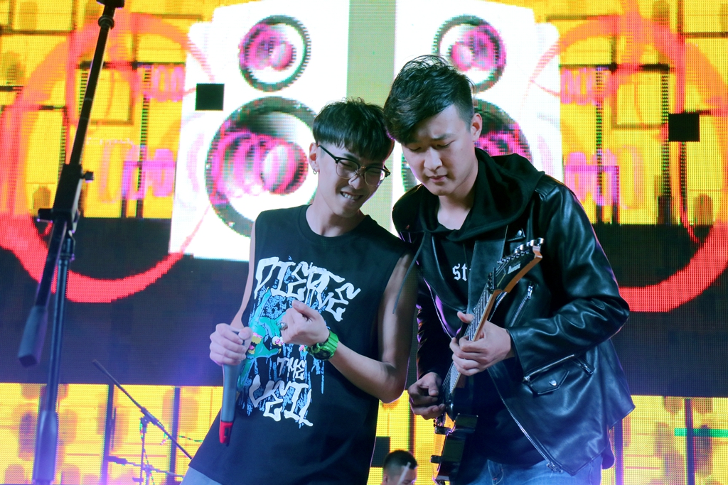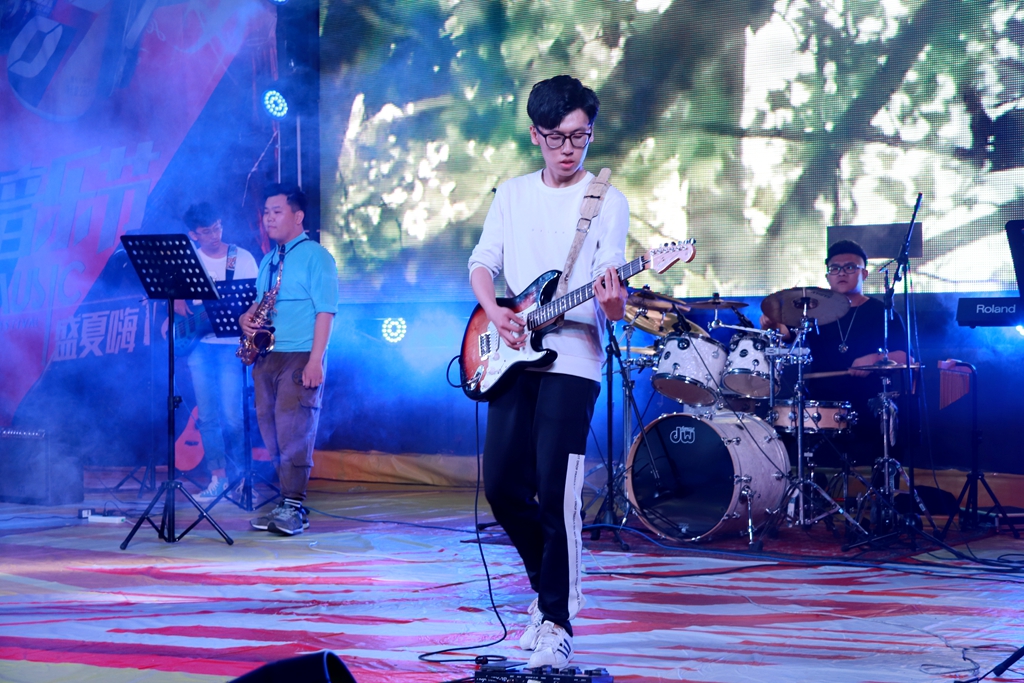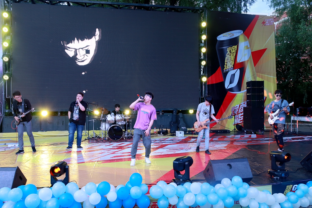 首先閃亮登場(chǎng)的是工建路46號(hào)樂隊(duì),在燈光閃耀下6位搖滾的少年嗨唱著自己的態(tài)度。舞臺(tái)上他們迸發(fā)著青春、斗志昂揚(yáng)、永不低頭,仿佛整個(gè)廣場(chǎng)上的空氣都被他們點(diǎn)燃,彩燈照耀著的全是他們的不羈?!蛾柟庹小犯呖禾S,“讓我們乘著陽光,海上沖浪!”他們的跳躍帶著微笑,微笑時(shí)主唱臉上的酒窩好像可以甜化人的心房,今夜臺(tái)上的“陽光宅男”比音符更加閃亮。緊接著一首數(shù)碼寶貝的主題曲《butterfly》,妥妥的回憶殺,藏在童年心底的“八神太一”和“亞古獸”立刻被這首歌喚醒,在三致廣場(chǎng)上再次登場(chǎng)?!禨omething’s going on》帶著強(qiáng)烈的鼓點(diǎn),即使是最后一首歌卻依然抓耳,為他們的今晚表演畫上完美的句號(hào)。今天的“公建路46號(hào)”樂隊(duì)非常帥!
