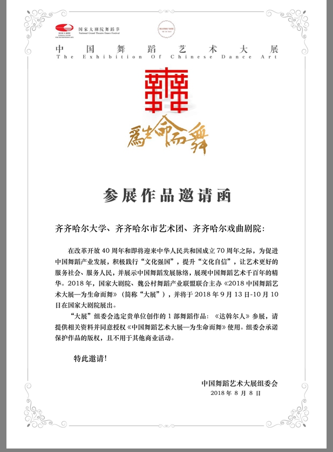 在改革開放40周年和即將迎來中華人民共和國成立70周年之際,為促進(jìn)中國舞蹈產(chǎn)業(yè)發(fā)展,積極踐行“文化強(qiáng)國”,提升“文化自信”,展現(xiàn)中國舞蹈藝術(shù)千百年的精華,2018年9月13日-10月10日,由國家大劇院、魏公村舞蹈產(chǎn)業(yè)聯(lián)盟聯(lián)合主辦的《2018中國舞蹈藝術(shù)大展—為生命而舞》,在國家大劇院展出。大展組委會(huì)選定由齊齊哈爾大學(xué)和齊齊哈爾市戲曲劇院聯(lián)合打造的大型風(fēng)情音畫《達(dá)斡爾人》參展。