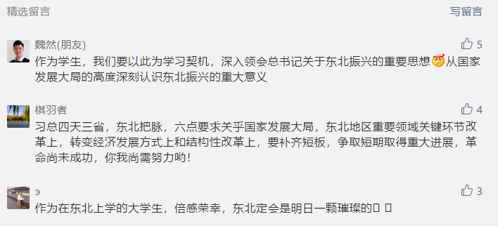 很多師生和校友還通過在我校官方微信公眾平臺“齊大頭條”留言的方式,表達他們觀看習(xí)近平總書記到我省考察調(diào)研相關(guān)新聞宣傳報道后的體會。