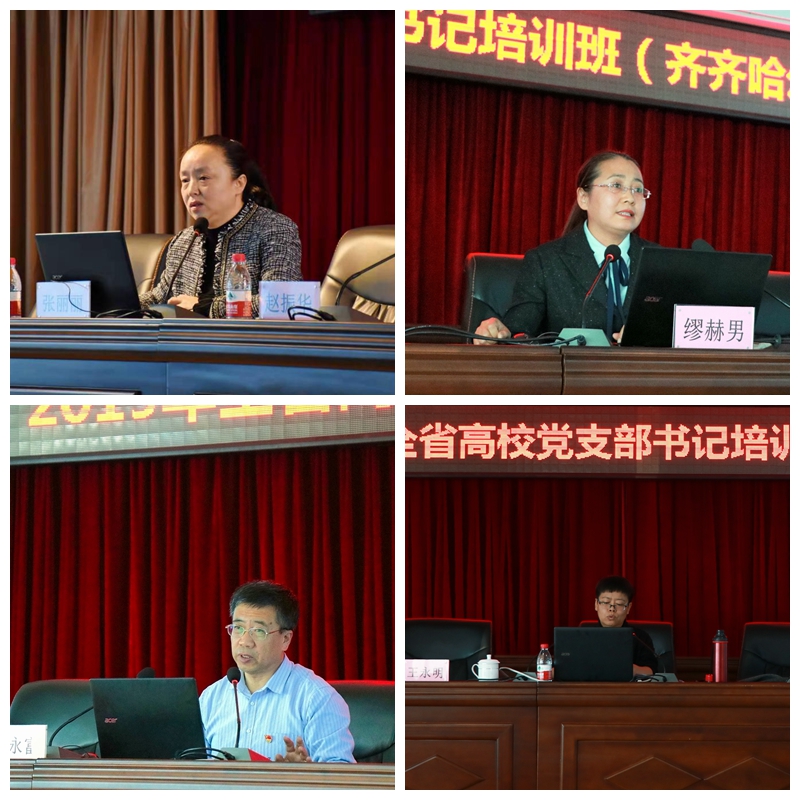 本次培訓采取理論輔導、案例分享、小組研討、會議交流相結合的方式進行。在理論輔導環(huán)節(jié),學校先后邀請了齊齊哈爾市委黨校教育長張麗麗、齊齊哈爾市委黨校馬克思主義教育部主任繆赫男、齊齊哈爾市市委黨校經濟學教研部主任于勇富、齊齊哈爾大學馬克思主義學院基礎教研部主任王永明等四位教授圍繞習近平總書記在“不忘初心、牢記使命”主題教育工作會議上的重要講話精神、習近平關于“不忘初心、牢記使命”的重要論述、習近平總書記關于教育的重要論述等內容作了專題報告;在案例分享環(huán)節(jié),我校文學與歷史文化學院原歷史系黨支部書記黃志強、哈爾濱師范大學馬克思主義學院基礎教研室教工黨支部書記熊玉坤、東北農業(yè)大學臨床獸醫(yī)學教師黨支部書記李金龍、黑龍江東方學院教工第一黨支部書記姜博、哈爾濱理工大學石榴籽工作室黨支部書記任佳偉、齊齊哈爾醫(yī)學院精神衛(wèi)生學院第三黨支部書記付偉分別結合工作實際,與大家分享了黨支部建設工作中的亮點和經驗;在小組研討和會議交流環(huán)節(jié),參訓學員結合“不忘初心、牢記使命”主題教育工作及黨支部“規(guī)范化建設工程”,圍繞“如何在黨支部抓好學習教育,抓好檢視整改?!薄叭绾巫龊眯聲r代高校黨支部工作,發(fā)揮黨支部戰(zhàn)斗堡壘作用和黨員先鋒模范作用”“如何實現(xiàn)黨支部建設工作目標”等問題展開了熱烈的研討,通過交流,學員們分享了自己在日常工作中積累的好做法,學到了兄弟院校的成功經驗,增強了做好院系黨建工作的信心。