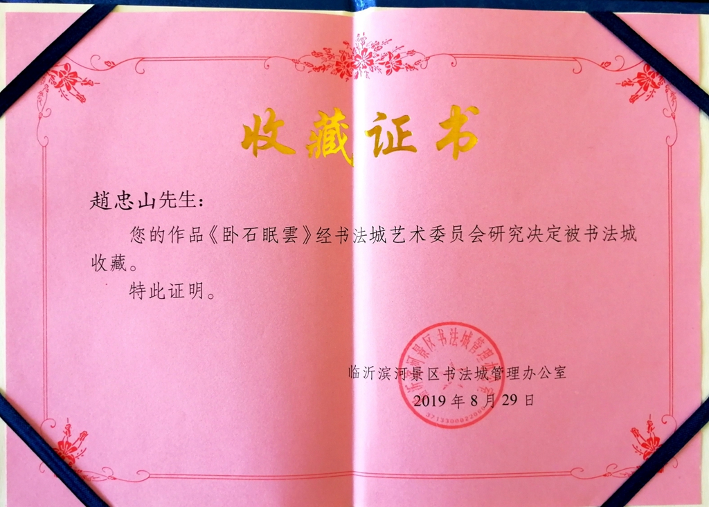 10月28日,我校文學(xué)與歷史文化學(xué)院(新聞傳播學(xué)院)趙忠山教授的書法行書自作詩《臥石眠云》入選山東臨沂晉代著名書法家王羲之故鄉(xiāng)“中國書法城”書法展并撰刻碑藏。
