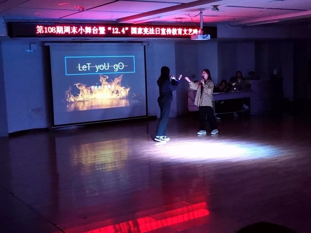 音樂(lè)與舞蹈學(xué)院在藝術(shù)樓四樓排練廳舉辦了第108期周末小舞臺(tái)歌手大賽暨“12·4”國(guó)家憲法日宣傳教育文藝晚會(huì),以通俗易懂的語(yǔ)言將法律法規(guī)知識(shí)巧妙融入,增強(qiáng)了大學(xué)生的法治觀念。