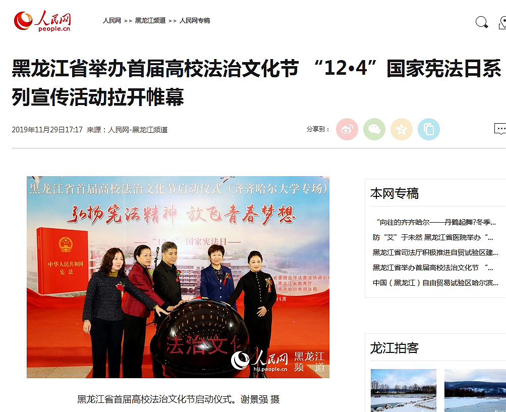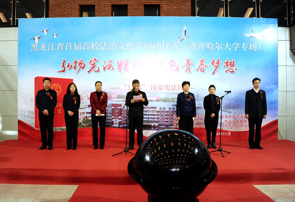11月27日下午,由省司法廳、省教育廳主辦,齊齊哈爾大學(xué)、齊齊哈爾市司法局承辦的以“弘揚(yáng)憲法精神 放飛青春夢(mèng)想”為主題的黑龍江省首屆高校法治文化節(jié)(齊齊哈爾大學(xué)專場(chǎng))在我校音樂(lè)廳隆重舉行,開(kāi)啟了2019年全省國(guó)家憲法日系列宣傳活動(dòng)。