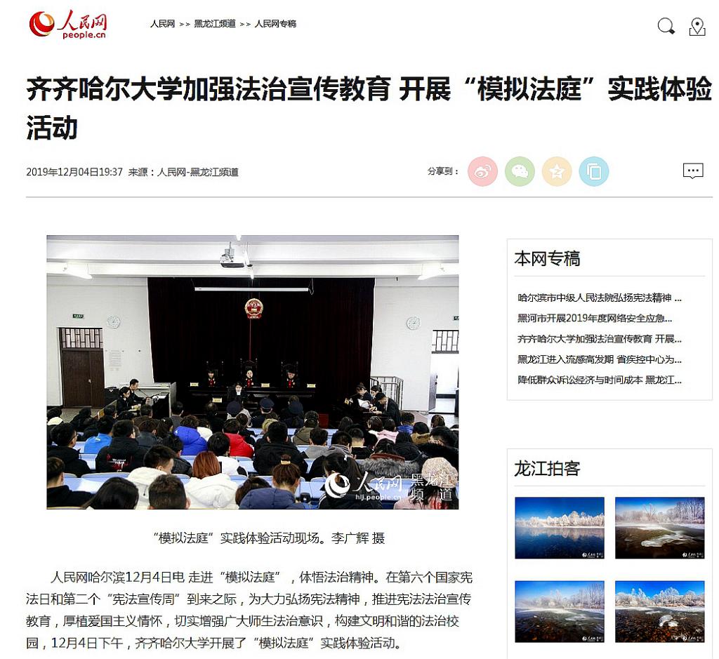 “模擬法庭”準(zhǔn)備充分、程序嚴(yán)謹(jǐn)、情景逼真、角色到位、點(diǎn)評(píng)精彩,取得了很好的效果,贏得了新聞媒體的熱切關(guān)注與熱忱報(bào)道。人民網(wǎng)、東北網(wǎng)、省教育廳官方網(wǎng)站等對(duì)此次活動(dòng)集中報(bào)道6篇(次),產(chǎn)生了積極而廣泛的社會(huì)影響。