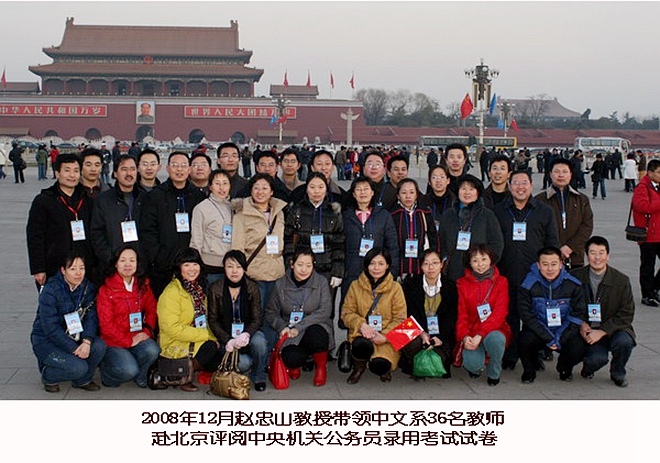 內(nèi)強(qiáng)素質(zhì)的同時(shí)還要外樹形象,2007年12月12日,應(yīng)國(guó)家人力資源部邀請(qǐng),他帶領(lǐng)36名中文系教師赴京評(píng)閱2008年中央機(jī)關(guān)公務(wù)員考試試卷,贏得了原國(guó)家人事部、各兄弟院校、兄弟單位的一致好評(píng),為齊齊哈爾大學(xué)、齊齊哈爾市,乃至黑龍江省爭(zhēng)得了榮譽(yù)。2008年,趙忠山教授緊緊抓住慶祝中文系建系五十周年的契機(jī),廣泛邀請(qǐng)社會(huì)各屆人士參與其中,廣泛聯(lián)系畢業(yè)生中有一定影響的學(xué)生積極為系慶作貢獻(xiàn)。2008年7月15日,在校領(lǐng)導(dǎo)的大力支持下,中文系成功舉辦建系五十年慶典活動(dòng),產(chǎn)生了良好的社會(huì)反響。多年來,中文系為我校教評(píng)創(chuàng)優(yōu)和創(chuàng)建省屬重點(diǎn)大學(xué)貢獻(xiàn)了力量,多次獲省、市、校的表彰和獎(jiǎng)勵(lì),被《光明日?qǐng)?bào)》、《中國(guó)教育報(bào)》、《齊齊哈爾日?qǐng)?bào)》等各大媒體熱忱報(bào)道。